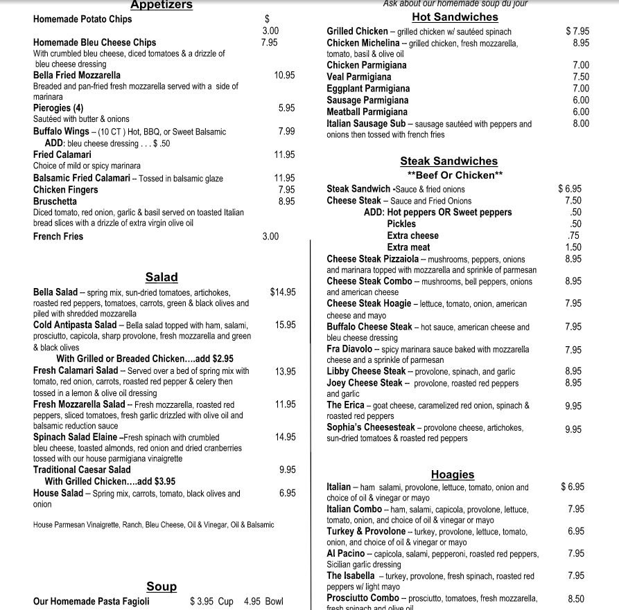 Takeout from either Bella’s or the cafe can be ordered all day by calling Cafe Erica at 610-748-1500.