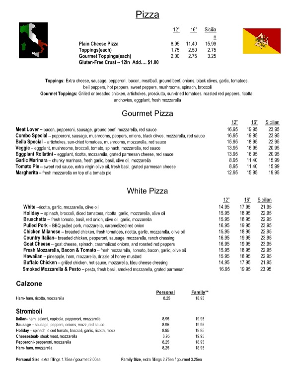 Regular pizza in 12-inch, 16-inch and Sicilian sizes, with or without toppings, is also available, along with gluten-free pizza (served on a 12-inch crust for $1 extra).
