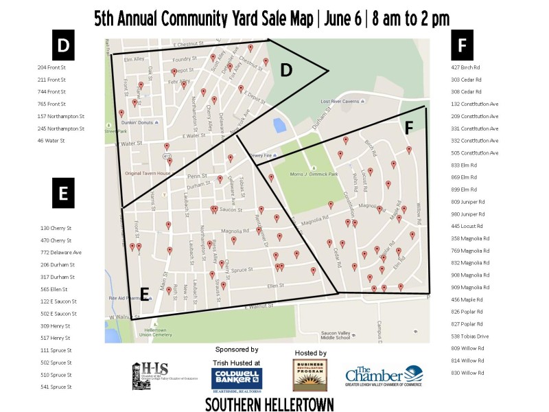 The Hellertown Community Yard Sale is sponsored by Trish Husted of Coldwell Banker Hearthside Realtors, Hellertown.