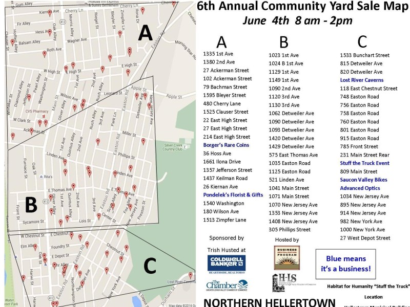 The Hellertown Community Yard Sale is sponsored by Trish Husted, Coldwell Banker Hearthside, Realtors, and hosted by the Borough Business Revitalization Program, the Hellertown-Lower Saucon Chamber of Commerce and the GLVCC.
