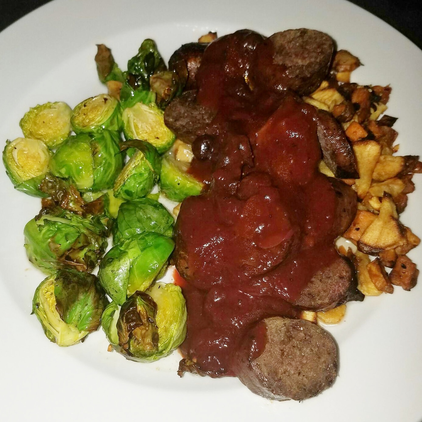 For dinner my guest and I both chose hearty meat dishes. I went for the classic NY Strip ($28) served with a portabello mushroom bordelaise sauce, potato au gratin and carrots. My guest was excited to try the Venison Sausage ($21) with blueberry barbecue sauce, sweet potato and parsnip hash, and roasted Brussel sprouts.