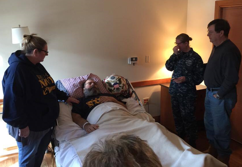 Operations Specialist Second Class (OS2) Elizabeth Fenerty was re-enlisted by her commanding officers from the base, who offered to drive four hours to the hospice so the ceremony could be performed at her stepfather Mark Price’s bedside.
