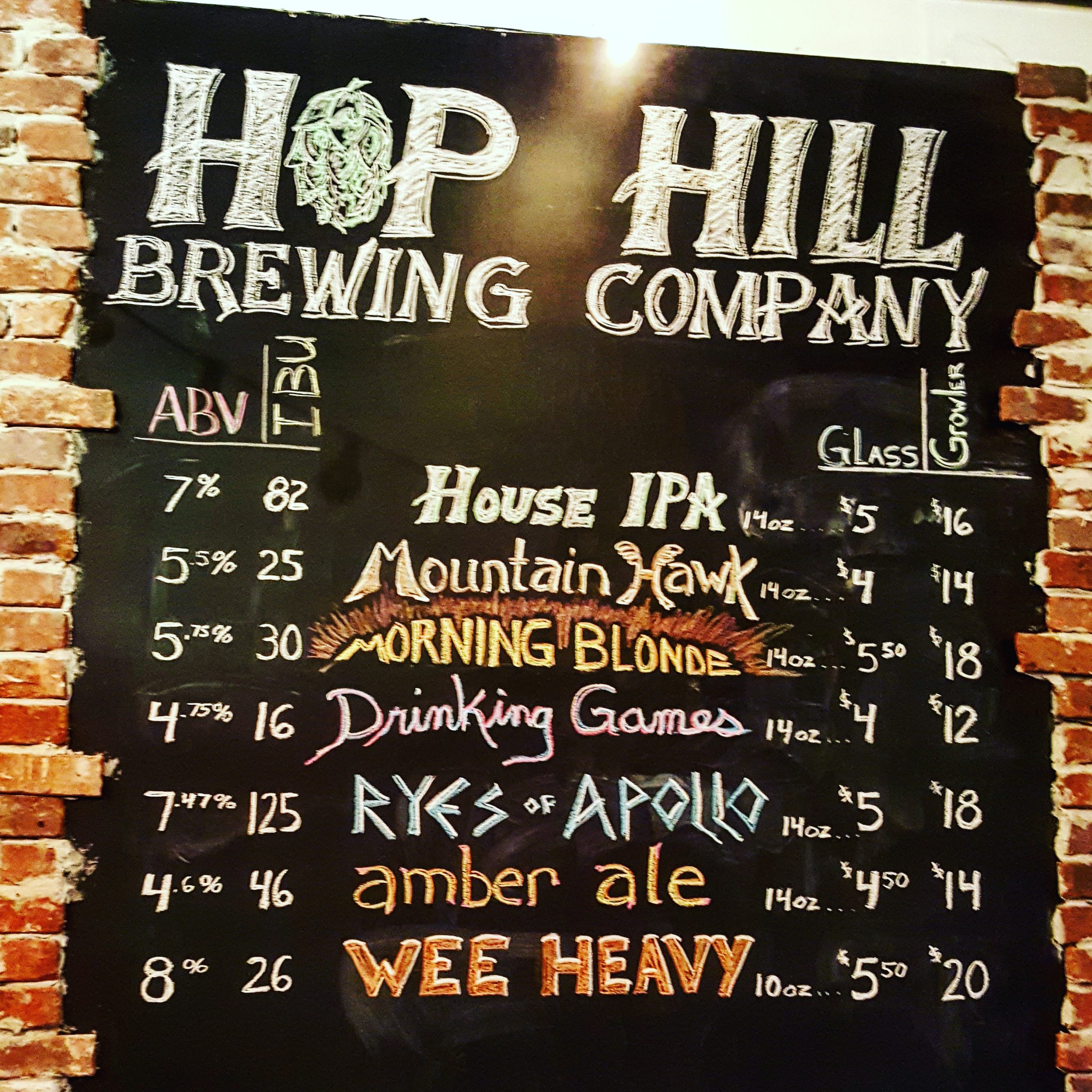 Those beers are House IPA (7 percent ABV), brown ale Mountain Hawk (5.5 percent ABV), Morning Blonde (5.75 percent ABV) and Drinking Games (4.75 percent ABV), which is the closest thing Hop Hill makes to a traditional American “lite” beer.
