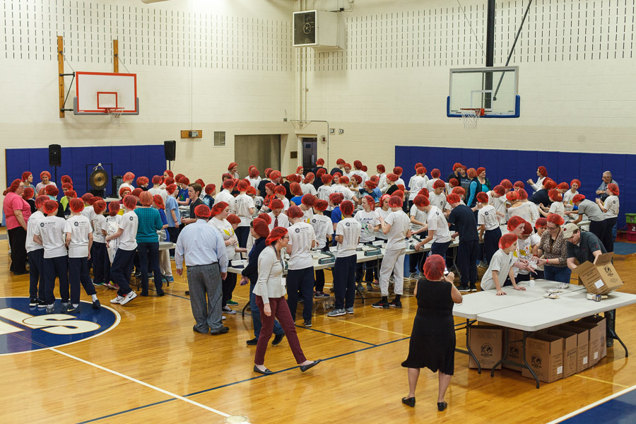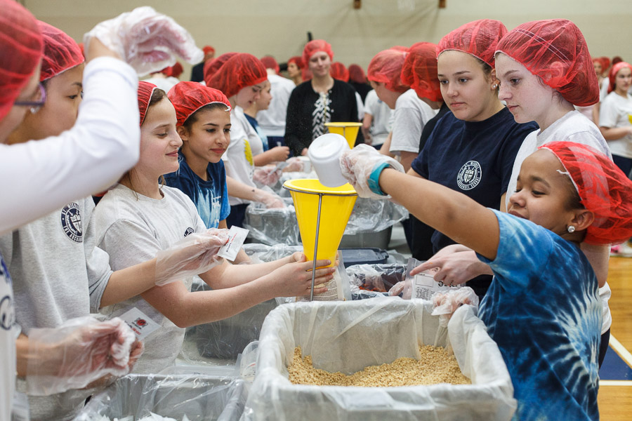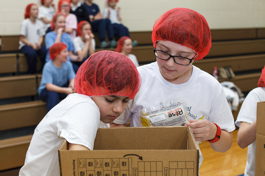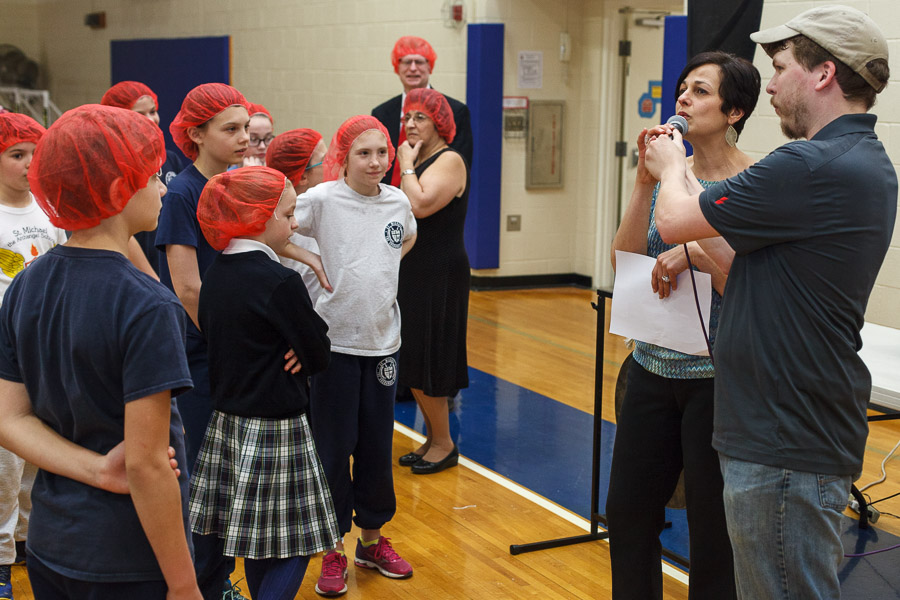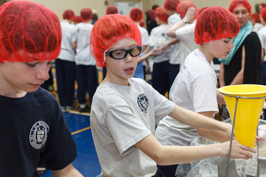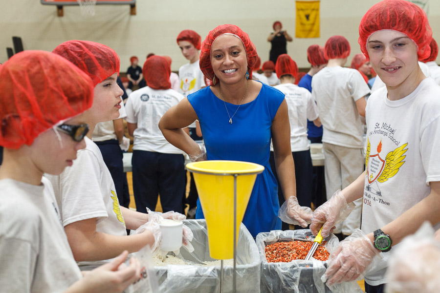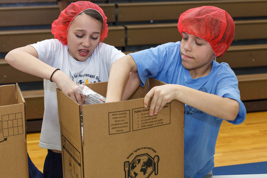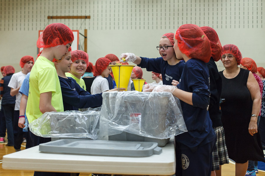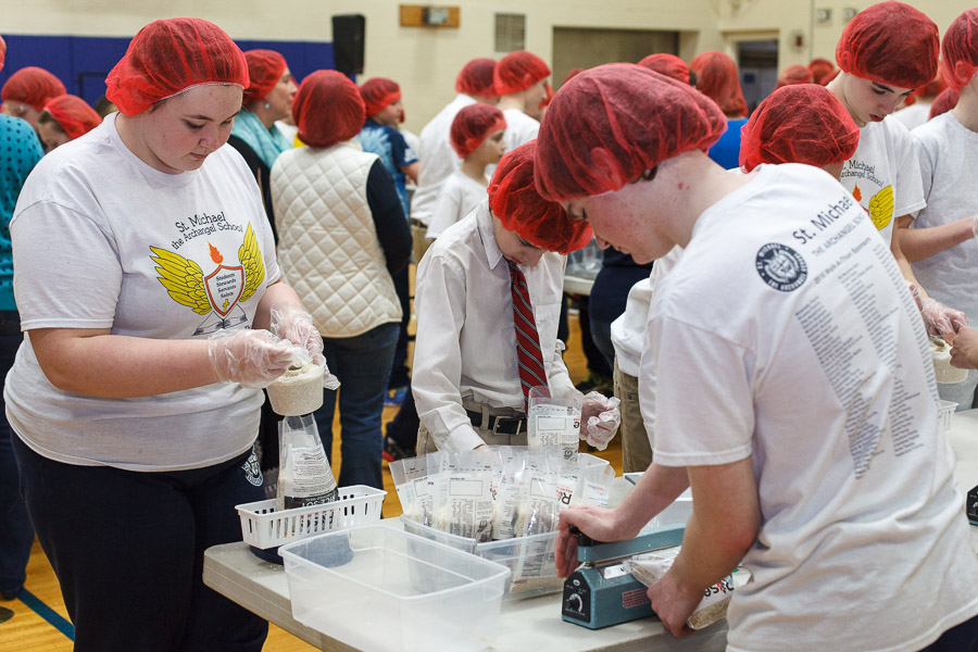 On Monday, April 3 the students of St. Michael the Archangel School in Upper Saucon Township gathered in the Hanlon Center gymnasium to help the needy of Burkina Faso. Partnering with Catholic Relief Services, grades five through eight filed in to tables set up throughout the gym and, while dancing in place to music, filled 10,000 meals containing rice, vegetables and vitamin packets.