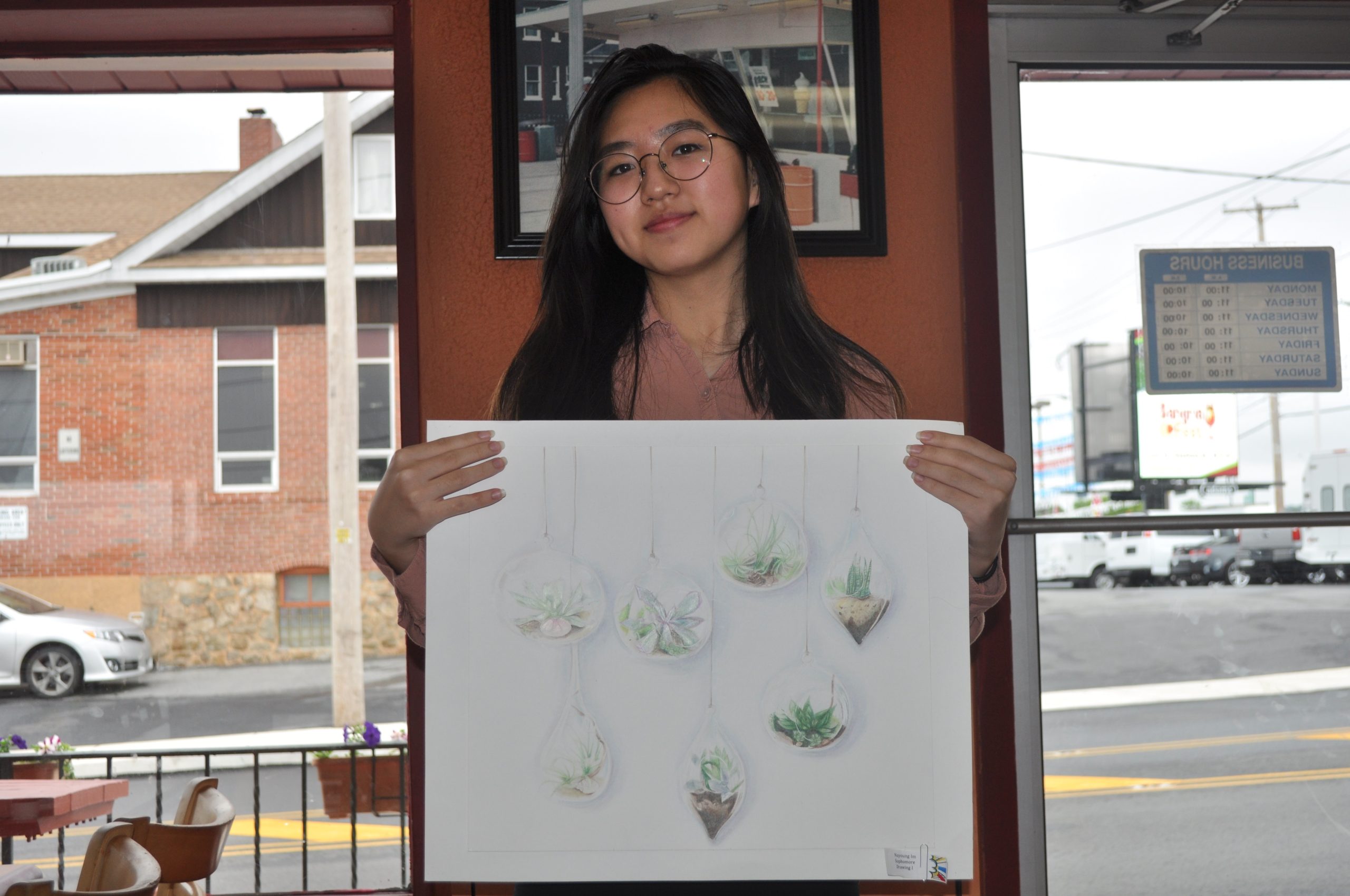 Nayoung Im just completed her sophomore year. Her teacher, Mr. Jason Gordon, said she created the hanging atriums using colored pencils on bristol board. She did an excellent job capturing the different tones of color in the plants. She also gave great attention and detail to the highlights and reflections from the glass vessels.