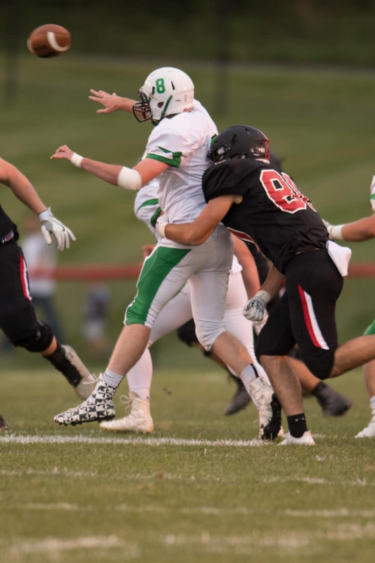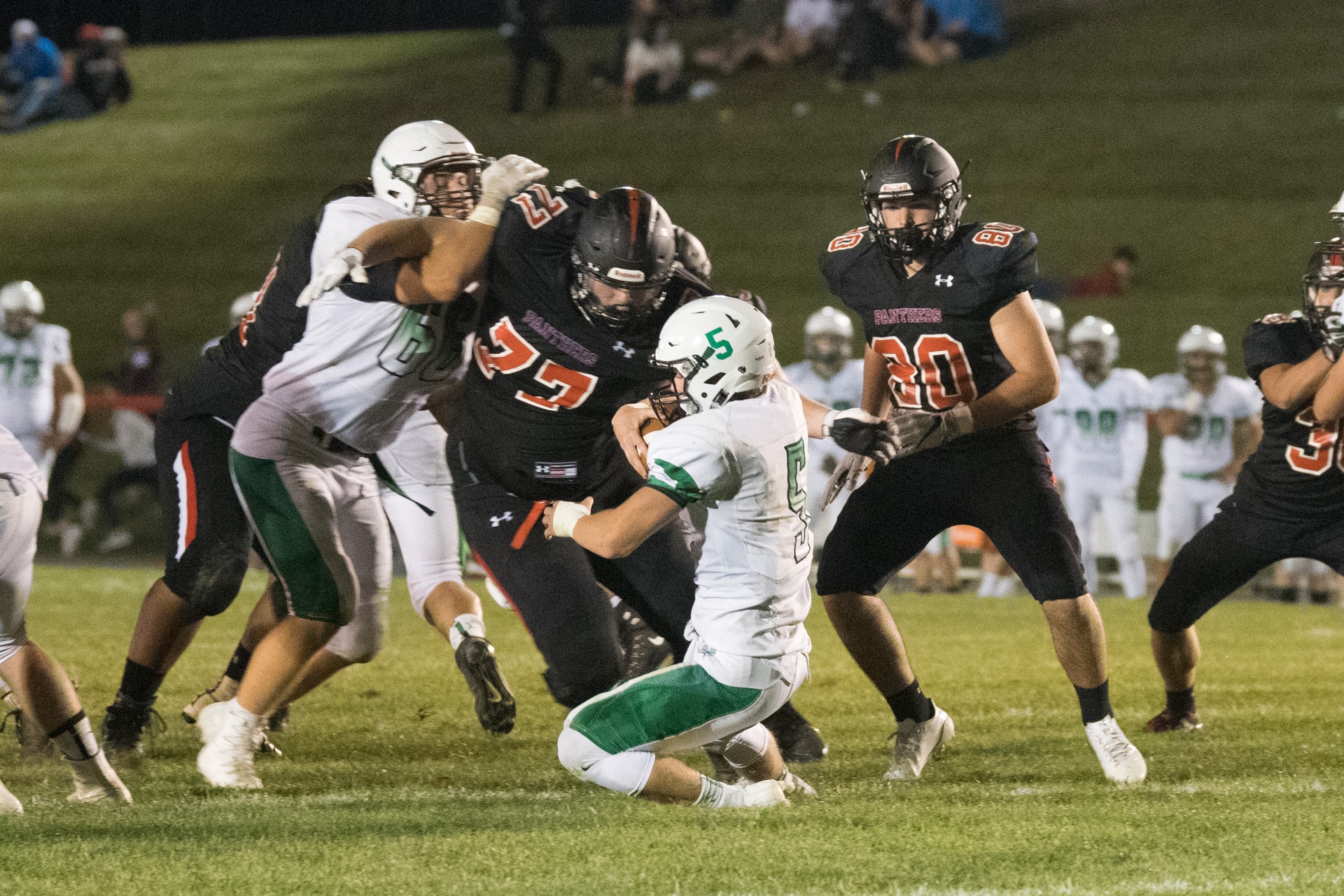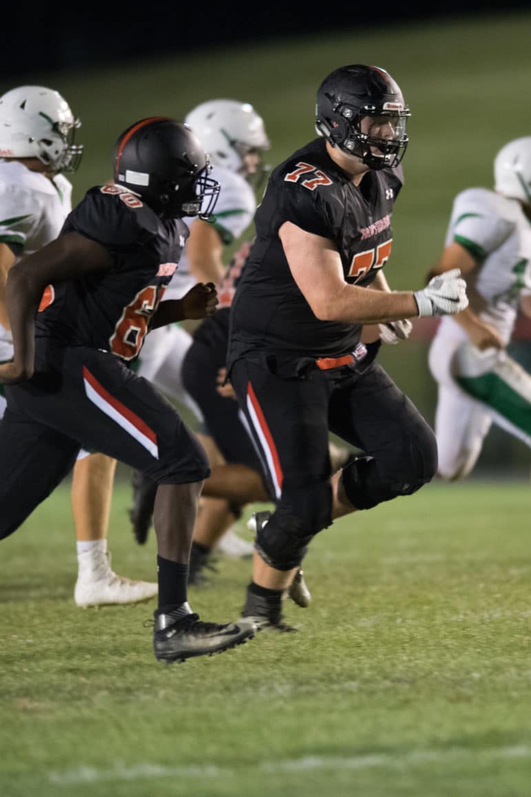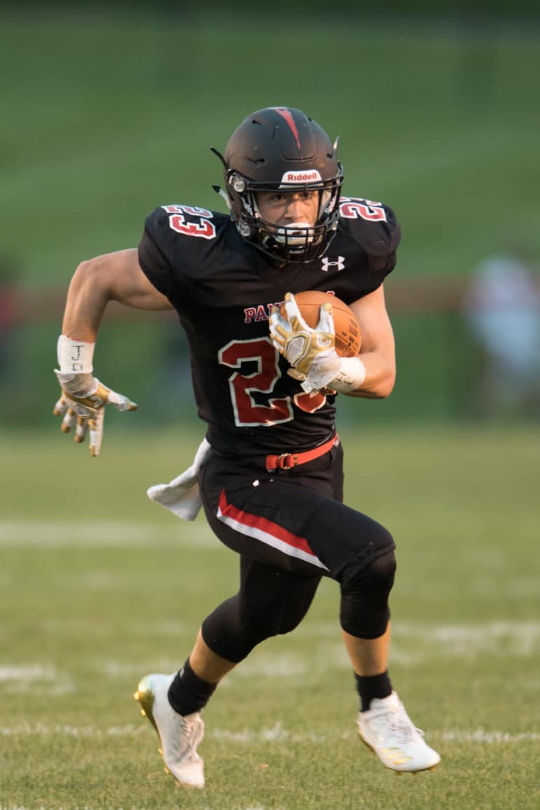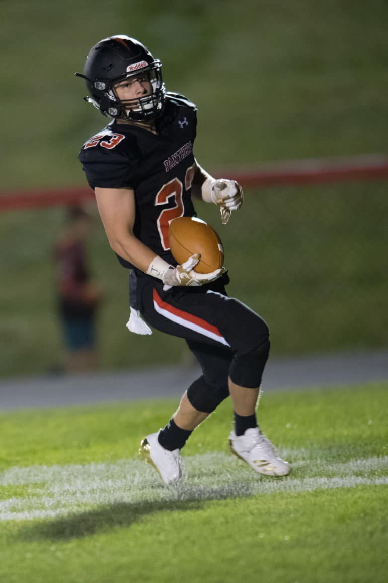 Pen Argyl looked dangerous as they forged a nine-play drive on their next possession and were methodically moving the ball against the Panthers. However, following a holding penalty and facing a 2nd & 23 from their own 45 yard line “lightning” would strike at the Green Knights. Pen Argyl quarterback, Anderson Dear, with outside linebacker Patrick Morrissey screaming off the edge and in his face on a blitz, put a little too much muscle on a pass that missed high and was intercepted by Zach Petiet. Escorted by an armada of teammates parading down the Pen Argyl sideline, Petiet cruised for a 68-yard pick-six. With just under six minutes remaining in the 1st quarter, Petiet’s interception and Erik Sundlof’s PAT gave the Panthers a 15-7 lead.