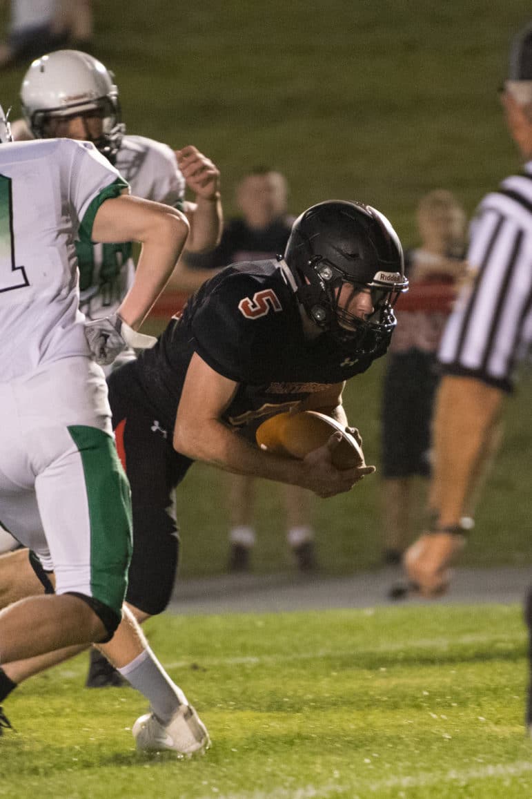 The two teams exchanged punts with the Green Knights regaining possession at the Panther 26 yard line. After nine plays Pen Argyl’s Logan Sterner found room around right end on a stretch play for a 1-yard touchdown. The PAT was good and with 4:14 left in the 1st half Saucon Valley’s lead shrunk to 22-14.