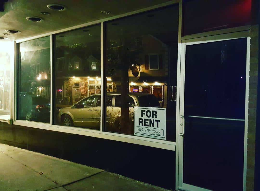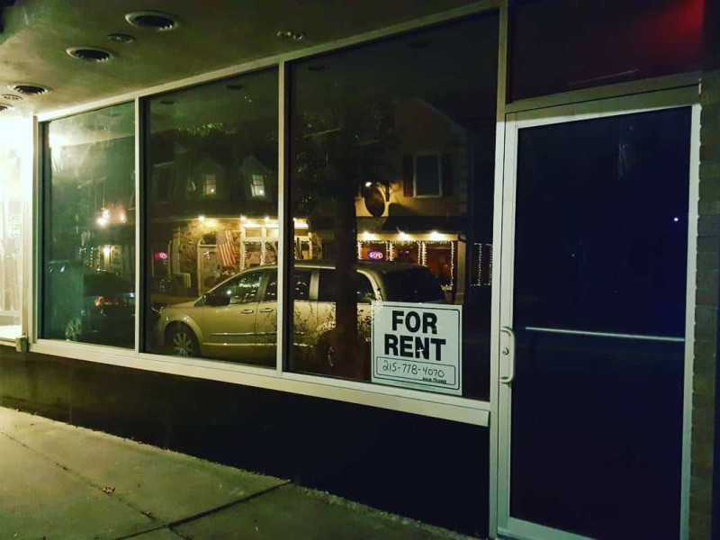 A “For Rent” sign posted in the front window instructs people interested in leasing the space to call 215-778-4070 and leave a message.