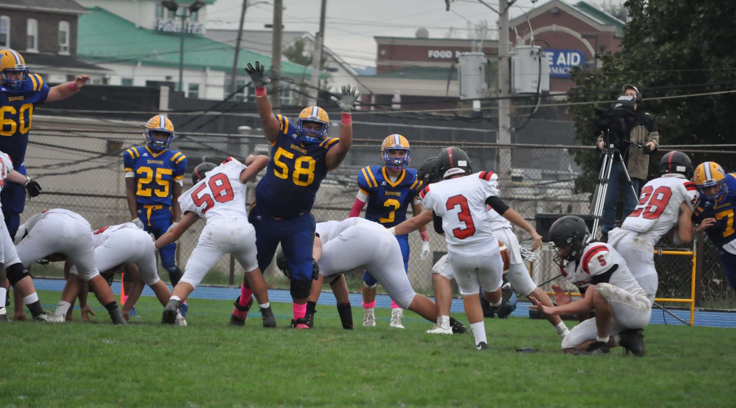 Saucon Valley’s Ian Csicsek returned the following kickoff out to midfield, but on the Panther’s very first play from scrimmage the Warriors Donnell Davis and his 310 pounds hooked Alstan Wolfe’s arm to force a fumble as Wolfe ran by him. Wilson recovered, but fumbled it right back to the Panthers when Patrick Morrissey stripped the ball while sacking Wilson’s Clark.