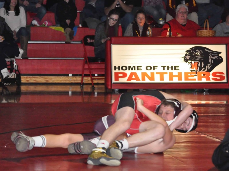 Against the Slaters, the Panthers earned pins from Dane Drunkenmiller (106), Nick Rosengrant (132), Justin Kyra (138), Angelo Mahaffey (160) and Jared Harka (220). Collectively, the five Panther pins came in approximately five minutes. Mahaffey decked his opponent in only :10 seconds. Saucon also received six team points as a result of Bangor forfeiting to Josh Jones (126).