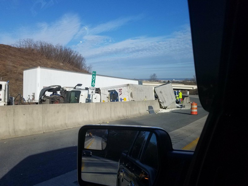 The breaking news page reported that it was a single vehicle accident and that the driver of the tractor-trailer that rolled over on the ramp was “up and walking” following his extrication from the vehicle.