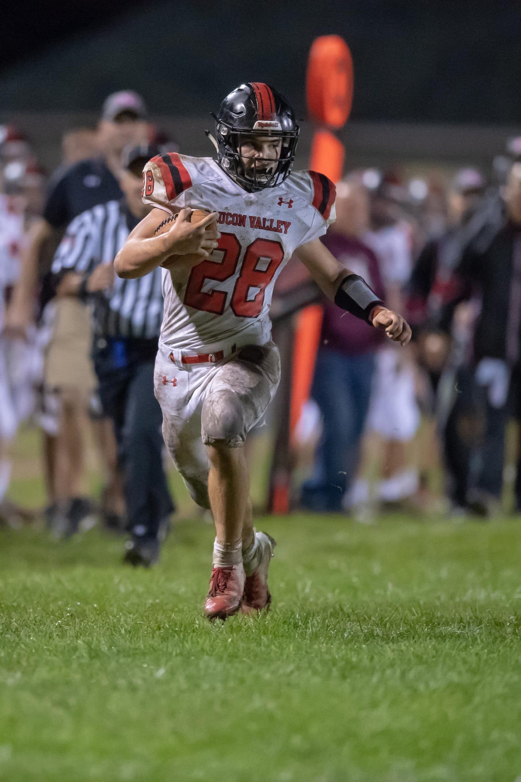 Saucon Valley’s defense forced another three-and-out punt and the offense went back to work. This time it was a six play drive capped by a 48-yard touchdown run by Csicsek. “Sizzler” cut up inside a slobber-knocker of a block by Christian Alling, powered through a couple of would-be tacklers and hit the end zone for the score. The PAT was good and at the end of the 1st Quarter Saucon extended their lead 14-0.