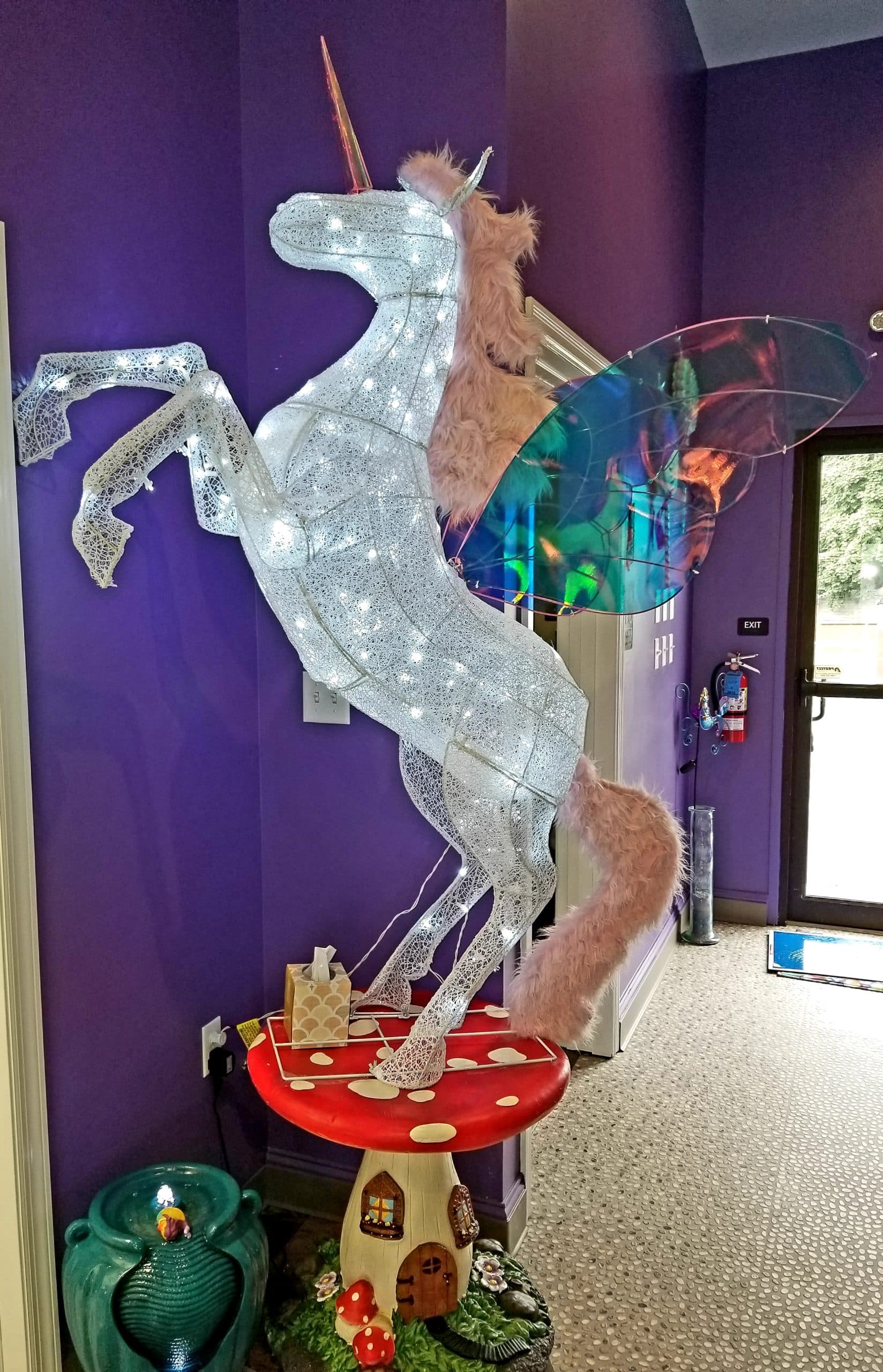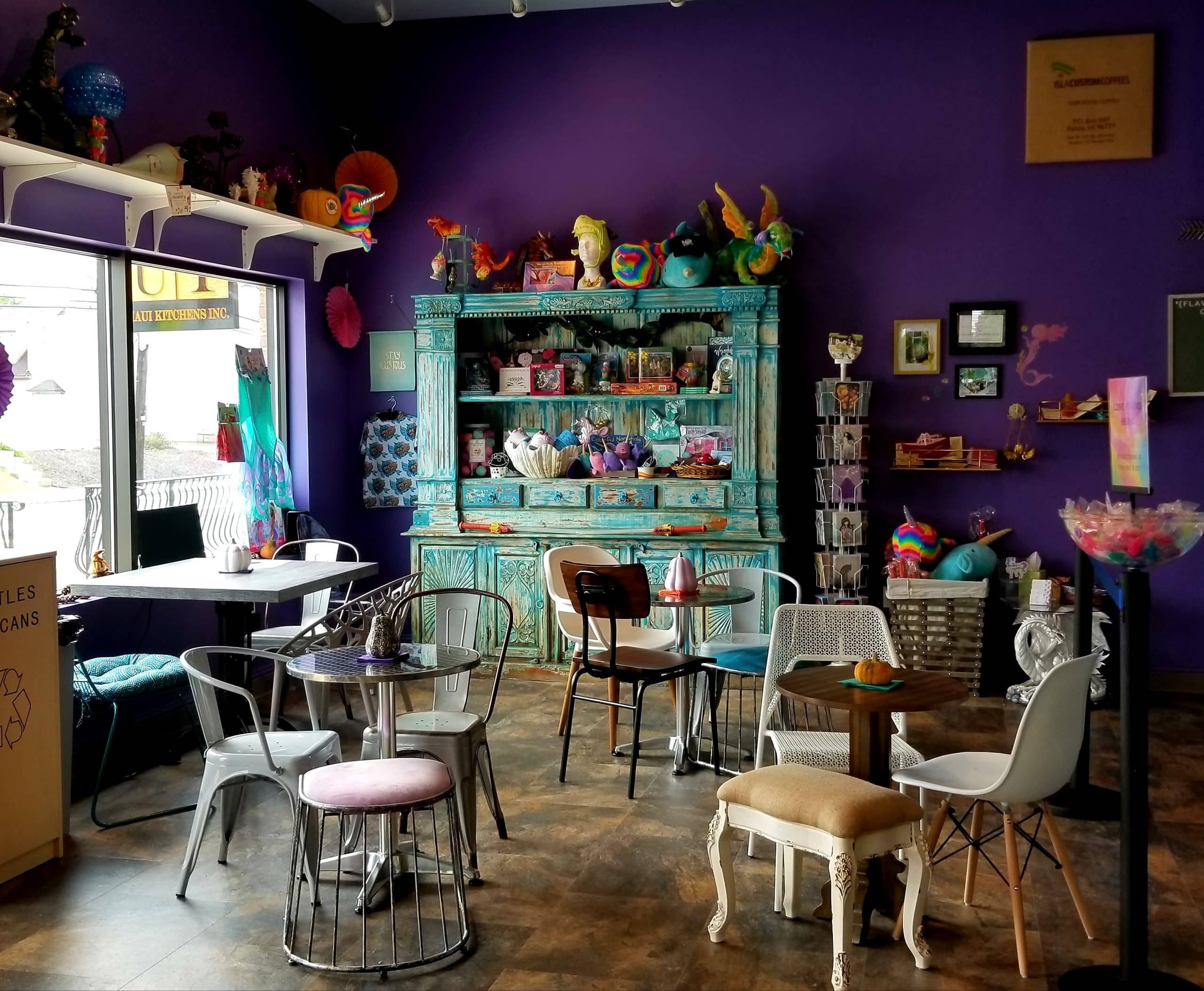 Co-owners Sherry Warren and Bob Weill have completely transformed the former flower shop into a veritable fantasyland filled with whimsical cafe-style seating/decor on one side and a colorful play area and party room on the other. The decor is eclectic and plentiful, with everything from a life-size lit unicorn mid-prance to a ceiling-suspended dragon to a mushroom tabletop with toadstool seating for little ones. Even the bathrooms are replete with things like a mermaid scale wall covering (for the girls) and a dragon-shaped toilet paper holder (for the boys).