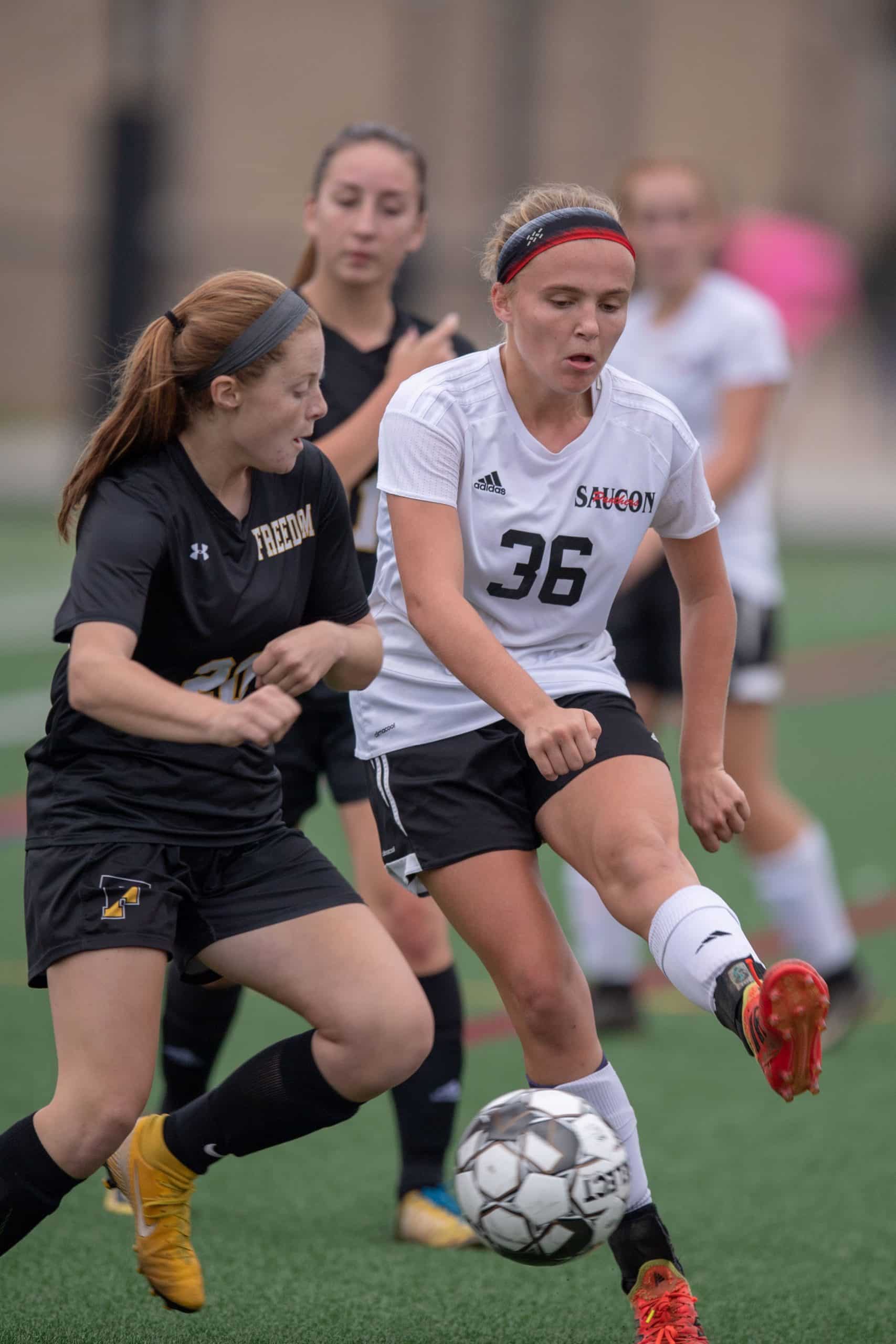 The early stages of Saturday’s girls soccer game proved to be a physical battle between Saucon Valley and host Freedom. However, sophomore Appoline Neveu and senior Brooke Riefenstahl changed that with 8:11 remaining in the 1st half. Neveu air-mailed another perfectly-placed corner-kick into the box. Riefenstahl created a little space and was able to head the ball just inside the far post. Saucon Valley took a 1-0 lead.