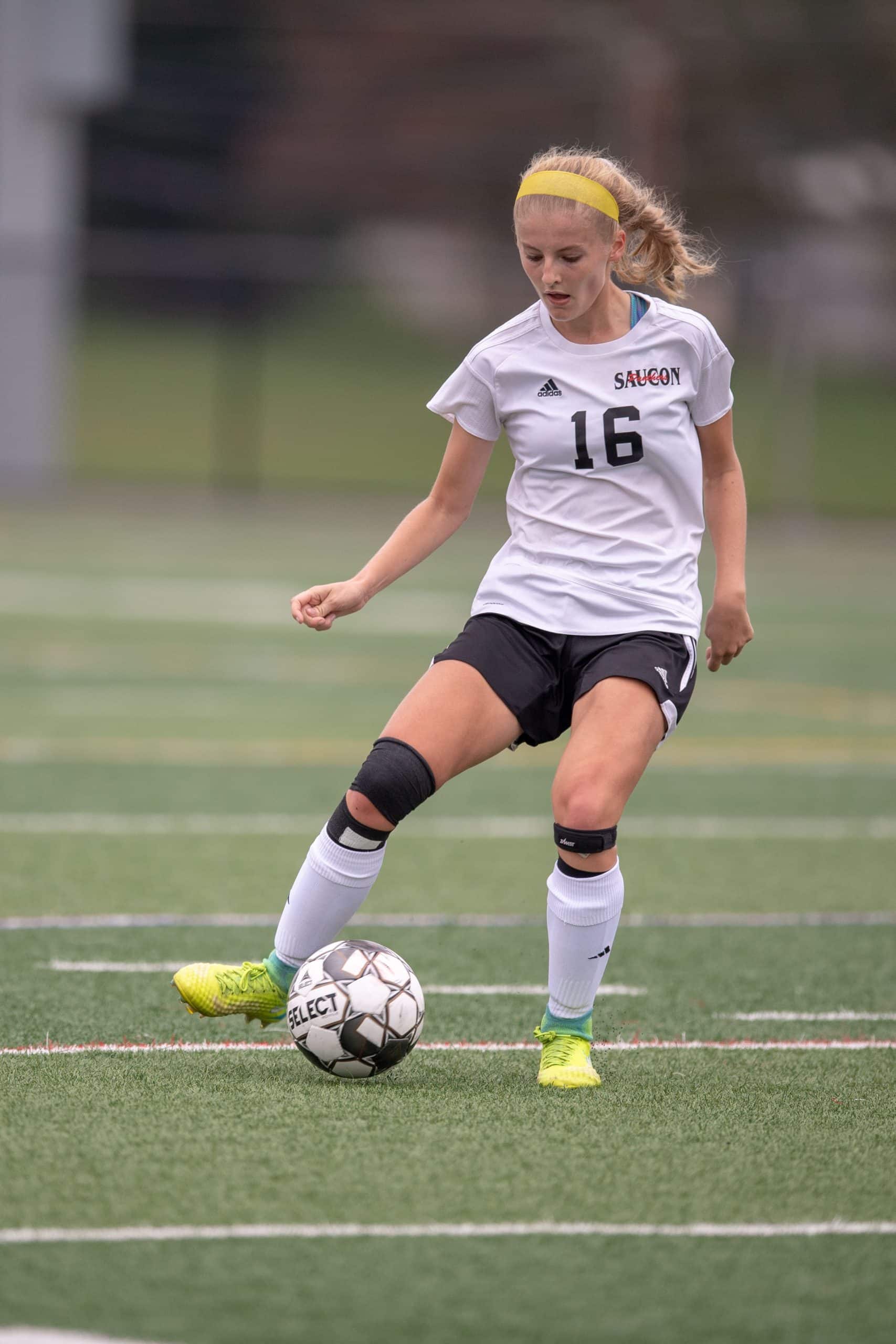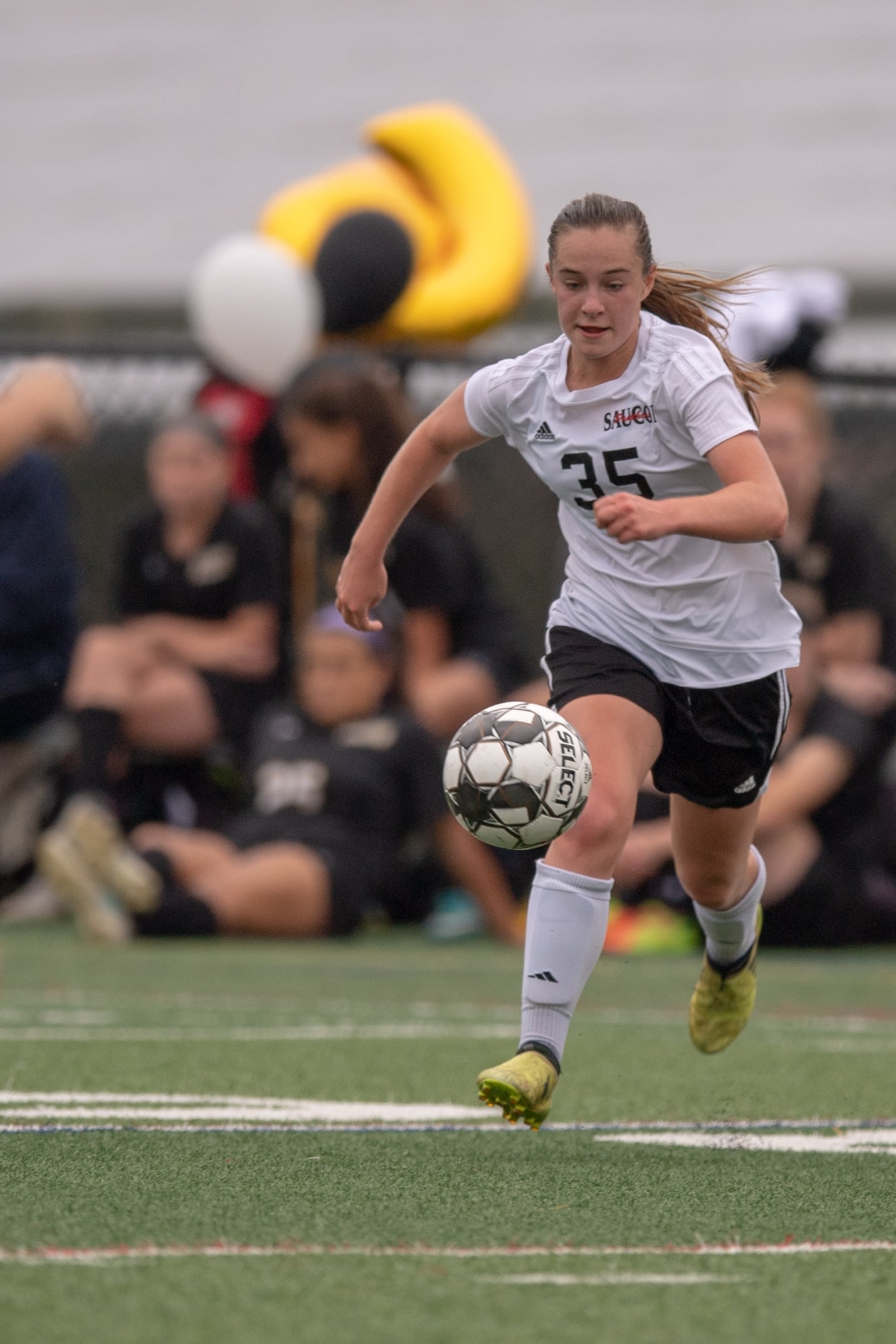 However, with only :21 seconds left to play in the 1st half, the referee called a tripping penalty against Saucon in the box, allowing a penalty kick to be awarded to the Patriots. Freedom took advantage of the called penalty and hit a sharp roller just past the diving Panther goalkeeper, Zoe Zaharakis. Freedom’s timely goal made it 1-1 at the half.