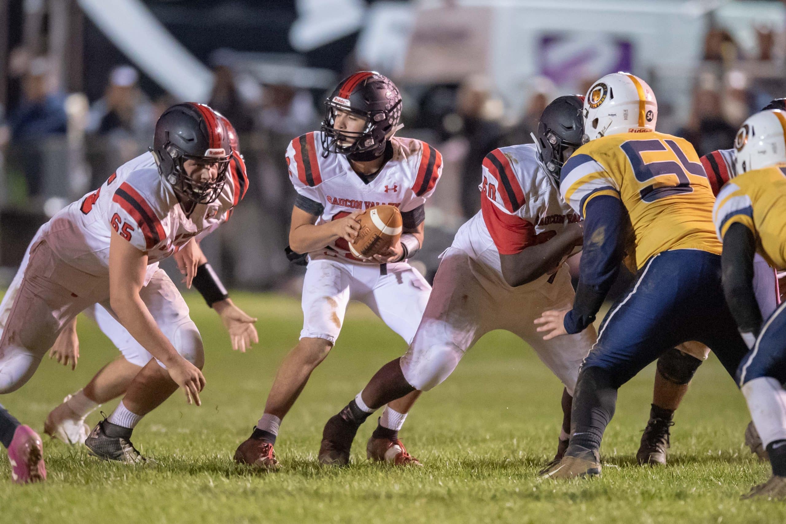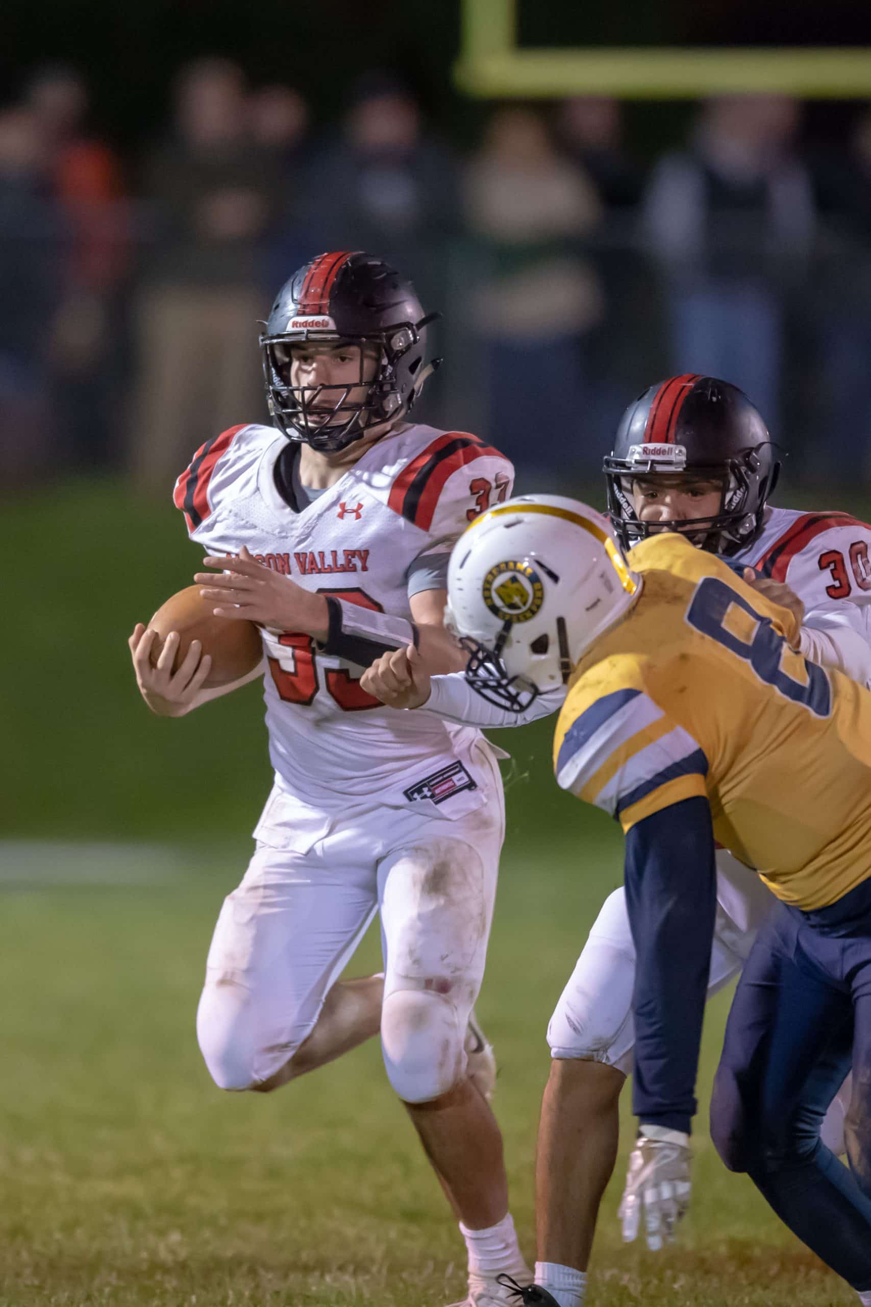 Saucon Valley was able to moved the ball deep into Crusader territory, but they were unable to convert a 4th & 22 after a penalty and sack ended the half with the score 21-14 in favor of the hosts.