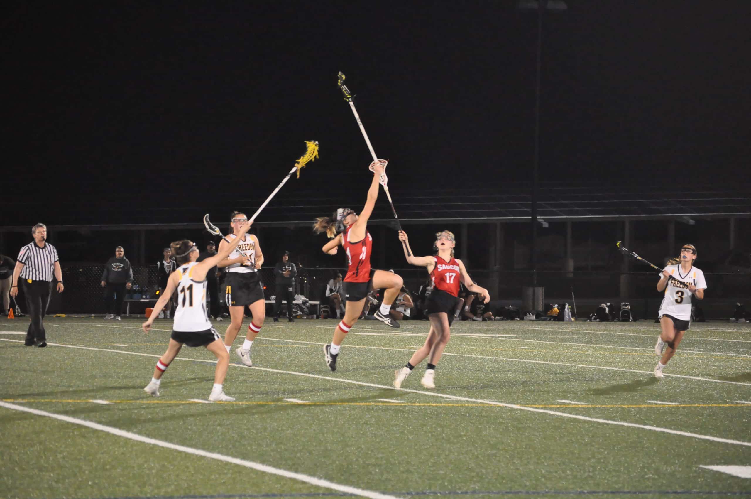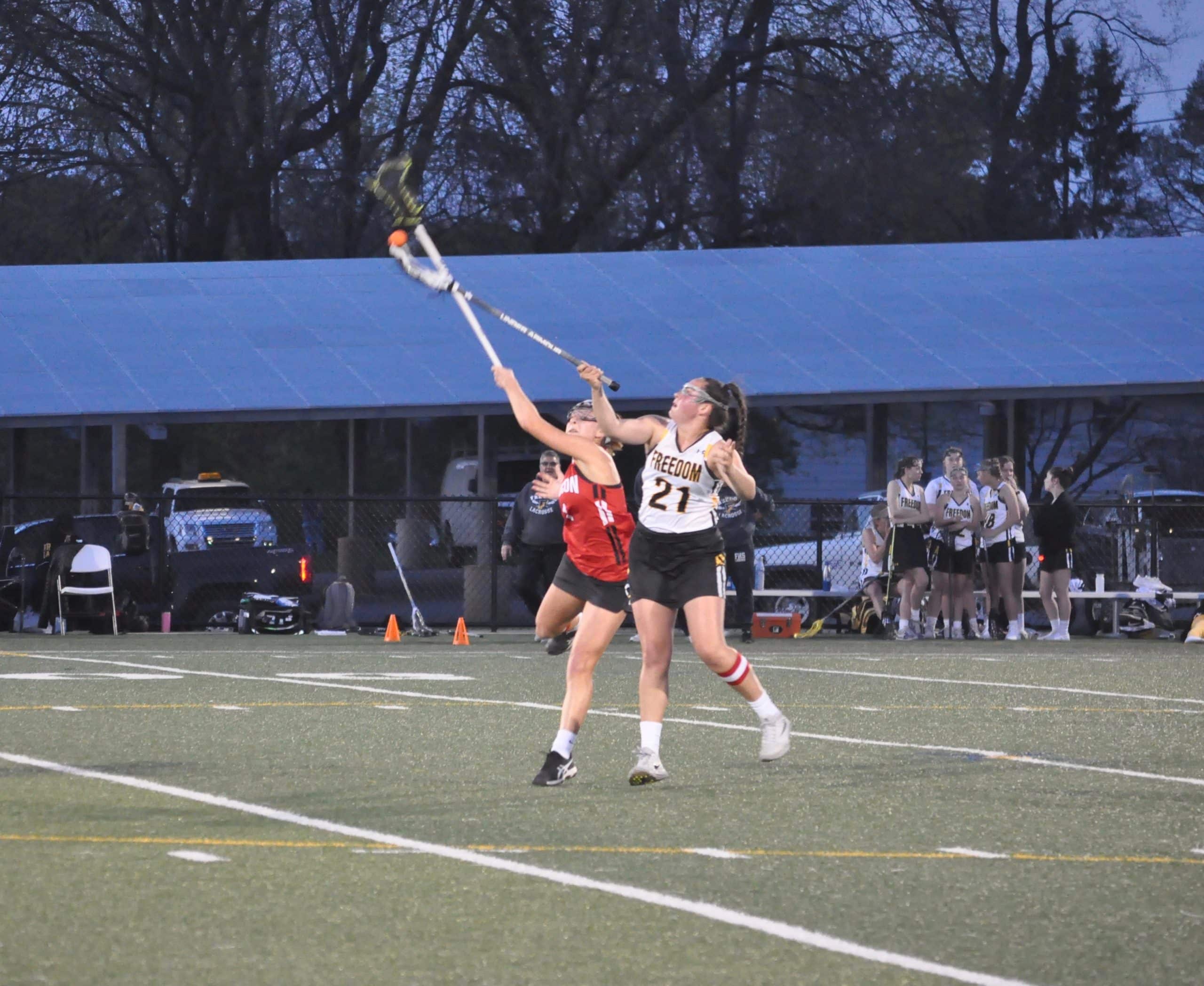 A little more than 48 hours after their big victory over previously unbeaten Southern Lehigh, the undefeated Saucon Valley girls lacrosse team travelled across town to Freedom for a Thursday night turf field fight against the Lady Patriots. The Pates were to be a formidable foe sporting a 9-2 record with their only losses coming at the hands of the powerful Easton and Parkland programs. In addition, the Lady Patriots had the highly-skilled services of junior Katie Flynn who, with her 83 goals last season, is on pace to become one of the Lehigh Valley’s top scorers in girls lacrosse history. It was to be a challenge that would need to bring out the best in the Panthers.