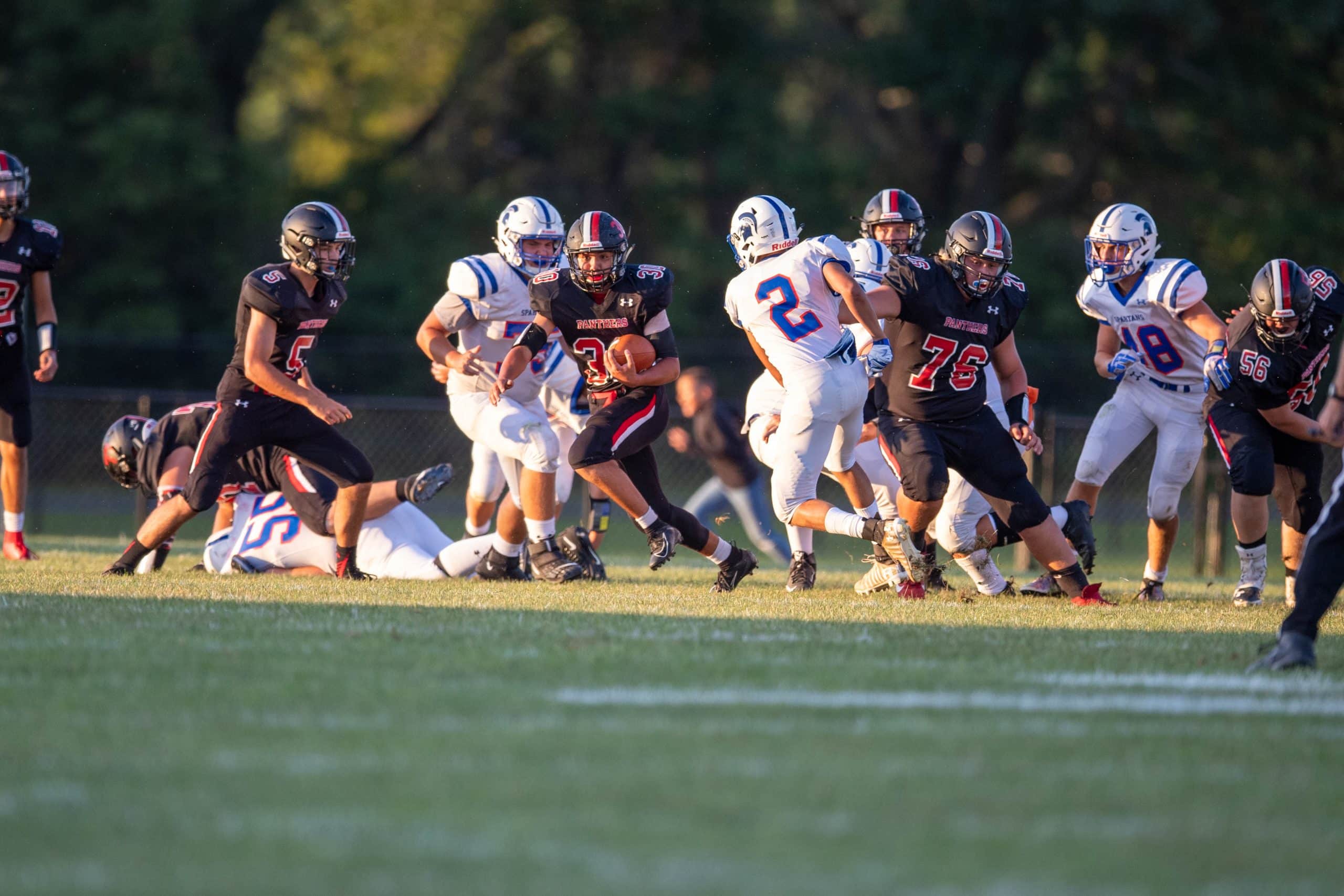 With about five minutes remaining in the first quarter and trailing Southern Lehigh 7-0, the Panther offense was deep in their own territory. On 3rd & 1 from their own 18-yardline, Saucon Valley called “Liz I 25 Lead”. Damian Garcia (#30) takes the handoff from Dante Mahaffey (#12) and gets a nicely executed cross-block from Nick Warnke (#77) and David Osman (#60) at the point of attack. Fullback, Chris Mann (#28) leads Garcia through the hole. Cody Swinney (#56) and Bobby Yovish (#67) do a good job getting bodies on defenders. Garcia hits the ‘5-hole’ hard to his left and then finds a seam in the Spartan defense back to the right as he pops through the line of scrimmage. From there, it is a footrace to the end zone that Garcia will win.