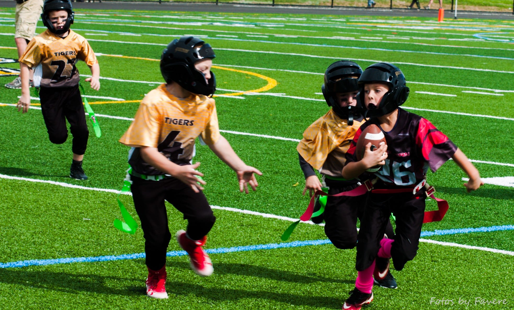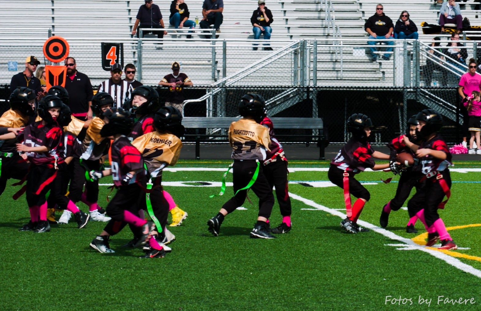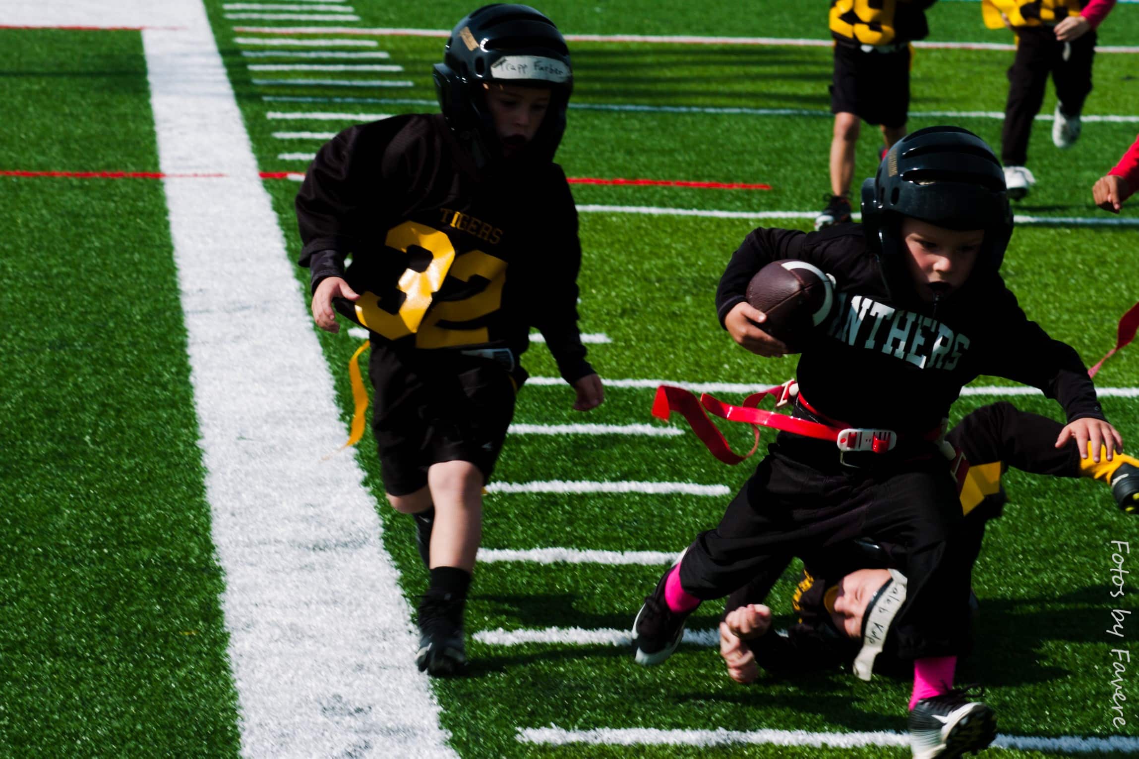 The Rookie Flag team has been playing very well lately and took the field first in this week’s action. The format this week was six-on-six with each team possessing the ball on offense for a quarter before switching to defense for the second quarter and then reversing the order after halftime. The Panthers started with the ball on offense and rattled off three straight 40-yard touchdown runs, then added a fourth just before their quarter ended. The defense was rallying to the ball in this game, and stopped the Tigers on several plays on their possession. After halftime, the Tigers got to start with the ball, and again the defense was able to stop them more often than not throughout the third quarter. The final quarter saw the Panthers take over the ball, and add on another pair of touchdowns. The defense was sparked by #14 Bryce Johnston’s 5 “tackles” 1 for loss performance and also by #11 Ezekiel Hallman’s 3 tackles 1 for loss effort, while the scoring was led by #2 Caius Wagner who had two touchdowns and 28 yards rushing, and #18 Benjamin Gangi with 65 yards rushing and a score. #28 Jerry Thomas, #3 Hudson Gonzales and #14 Bryce Johnston all contributed 40 yards rushing and a score each in the contest.