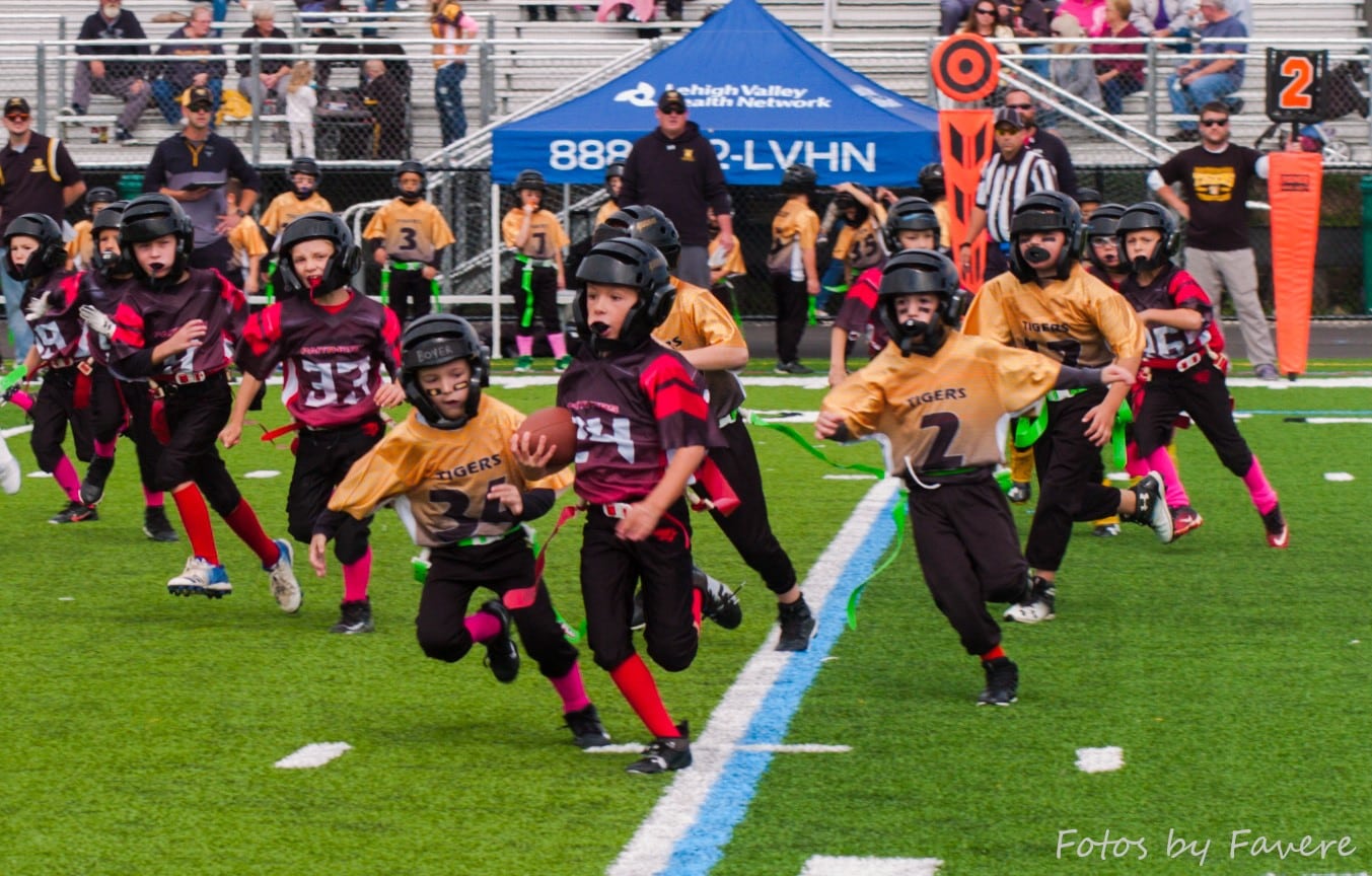 The final game of the day featured a rematch where these two teams went undefeated and met in the league championship with Saucon winning a hard-fought game for the trophy. The Tigers at 6-1 this season were looking to get even, and the coaches knew it would be another hard-fought game. The Panthers got the ball to start the game but after a few nice runs, the drive stagnated, and they were forced to punt. Saucon’s defense limited the Tiger offense on the next drive and forced them to punt as well. The Panthers got the ball again and grabbed the lead courtesy of a 54-yard touchdown run by #36 Jackson Albert, which allowed Saucon to take an 8-0 lead into the quarter break. The Tigers answered with a touchdown of their own on the next possession, then pounced on a fumble recovery, converting that into points quickly too. The Panthers stalled out their next drive, punted and sent out the defense again. The Tigers launched an eight-play drive that chewed up most of the remaining time in the second and concluded that with a touchdown as well, and took a 20-8 lead into the intermission. The third quarter began with the Tigers receiving the kickoff but two plays into that drive Jackson Albert recovered a fumble and ran it in for a touchdown, giving the Panthers some much-needed momentum and a great opportunity to stay in the game. The Tigers had other plans and tacked on two more scores in the third quarter. With time starting to dwindle, the Panthers went to work on offense and scored a touchdown on a very nice pass from #10 Peter Albano–to you guessed it–Jackson Albert. The next Tiger possession saw them fumble away the ball again and gave the Panthers hope for a comeback, but a questionable call led to Jackson fumbling the ball versus being down, and ended the comeback attempt. The offense was led by workhorse running back #36 Jackson Albert who amassed 192 total yards; 129 rushing on 15 carries and 63 receiving on two catches. #10 Peter Albano completed all three of his passes for 65 yards. The defense got strong play from #18 Hector Mateo leading the team with eight tackles, #25 Anthony Maholland with six tackles and #36 Jackson Albert who chipped in five tackles along with his scoop-and-score fumble recovery touchdown. The Panthers never gave up, playing hard until the end, but came out on the short end of a 32-22 scoreboard. They now sit in a tie for fourth place but somehow are seeded behind a team they beat head-to-head.