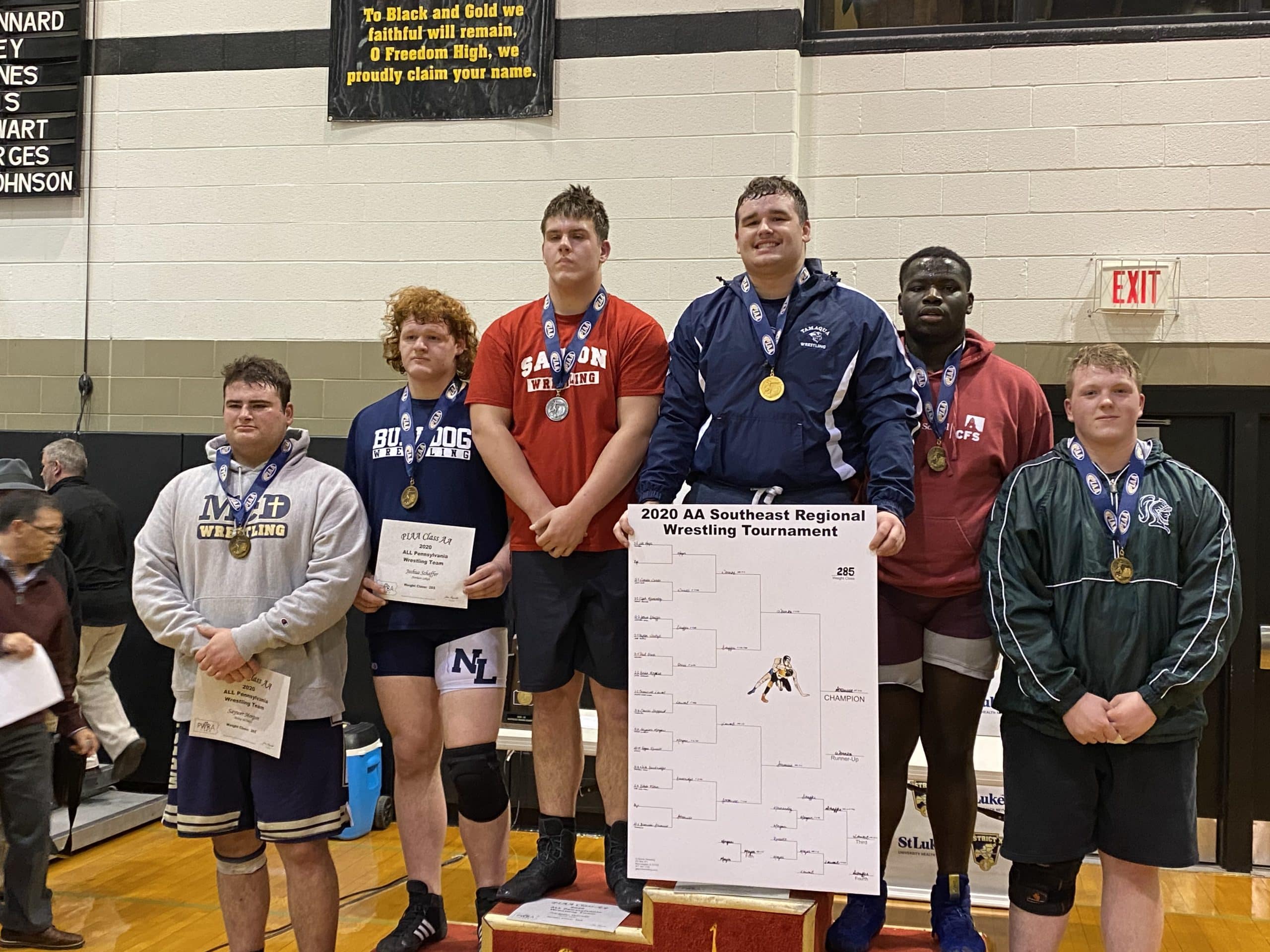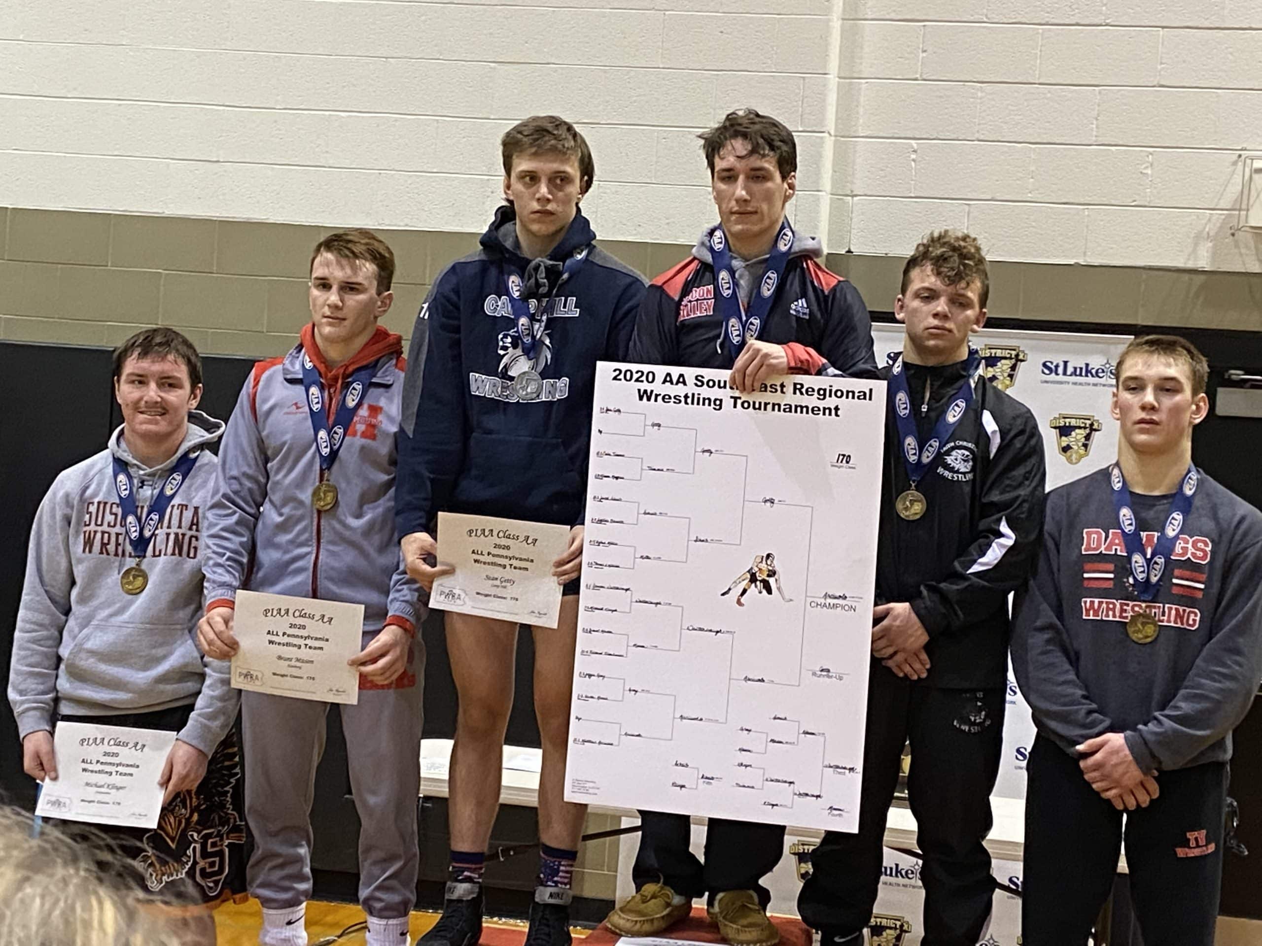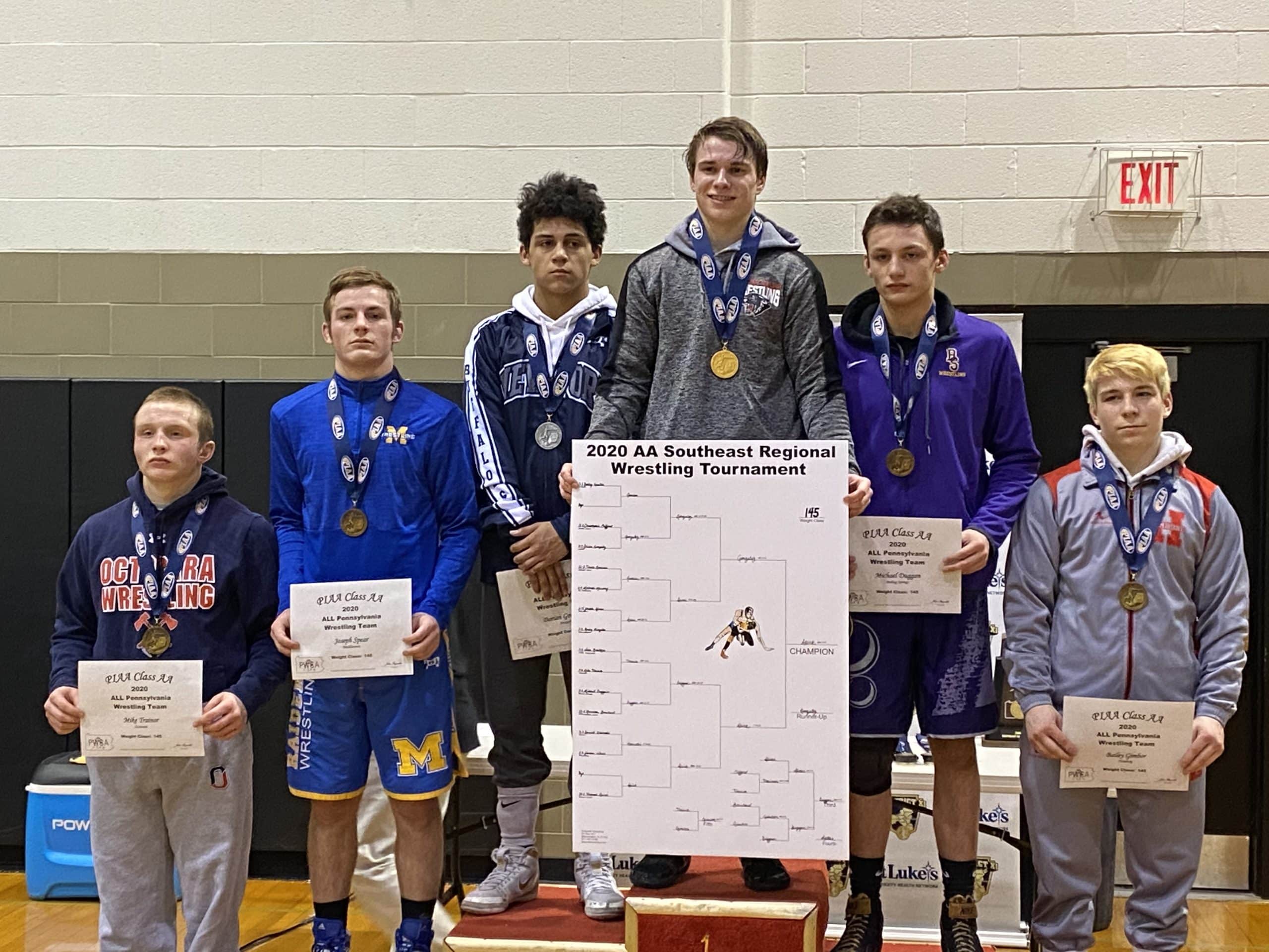 Jake Jones (138), Thomas Spirk (145), Matt Arciuolo (170) and Dane Csencsits (182) each finished atop the Southeast Regional podium. Jones, a freshman, will join the senior trio for his first trip to Chocolatetown and compete for his first state wrestling title. Spirk and Arciuolo are returning state medalists. Spirk finished 8th last year while Arciuolo was 3rd. Csencsits is now a four-time PIAA state qualifier.