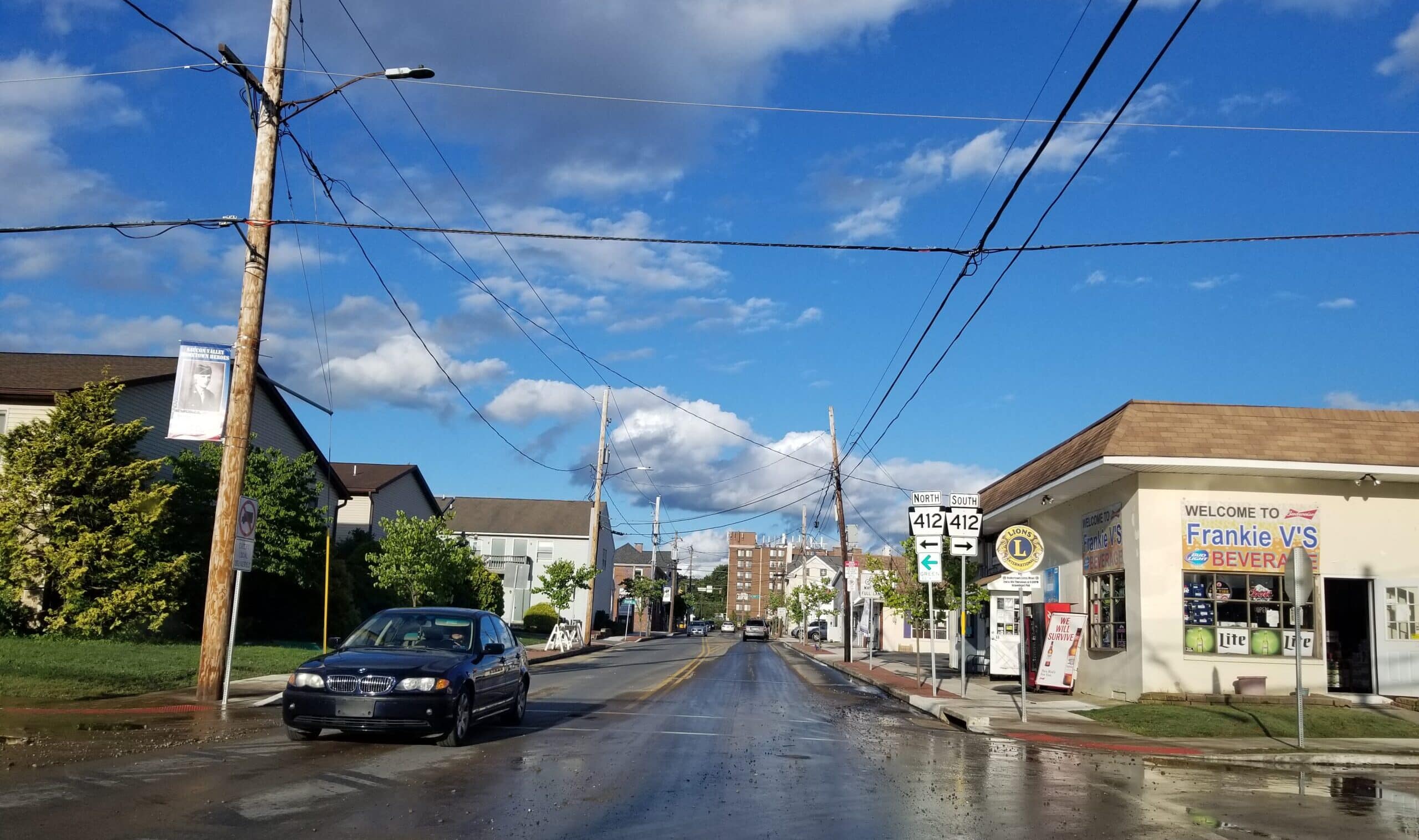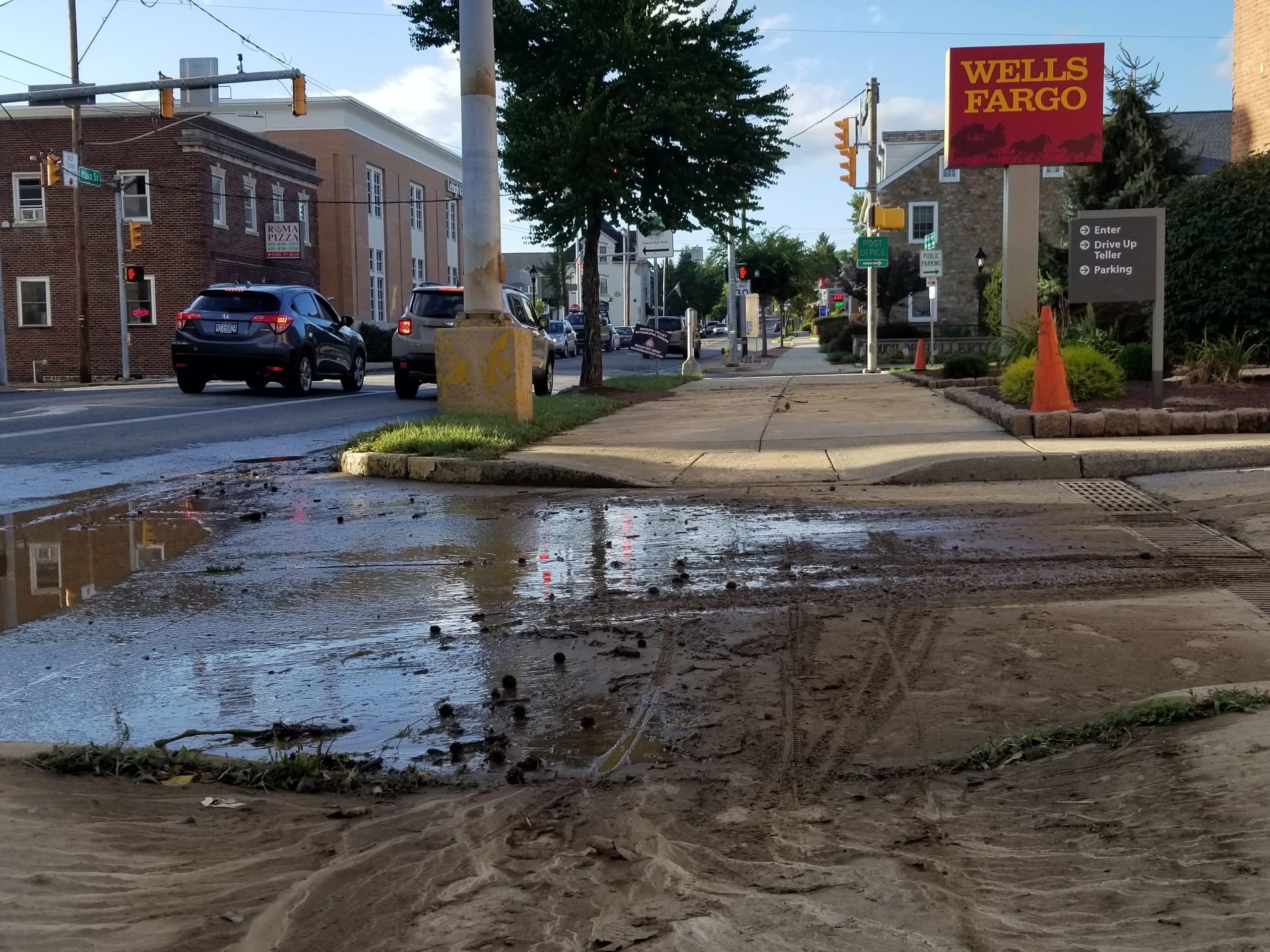 A large puddle and some mud were signs of the flooding that occurred earlier at the intersection of Polk Valley Road and Main Street (Rt. 412) on the border between Hellertown borough and Lower Saucon Township.