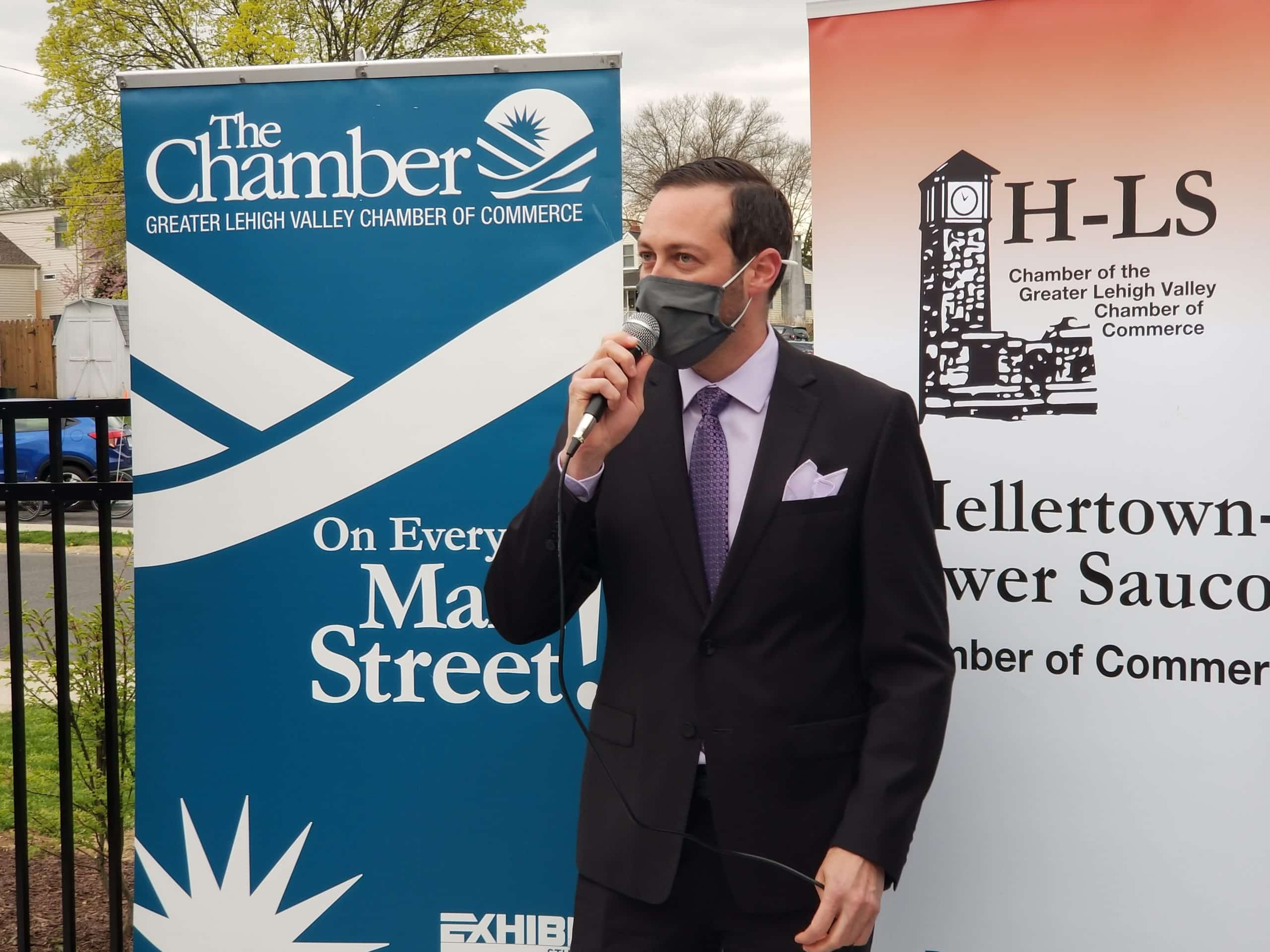 There was double the excitement at Hellertown’s Dewey Fire Company Thursday, as ceremonial ribbons strung by the Hellertown-Lower Saucon Chamber of Commerce were cut on a newly-renovated bar, Frontline at the Dewey, and by caterer Joe Stout.