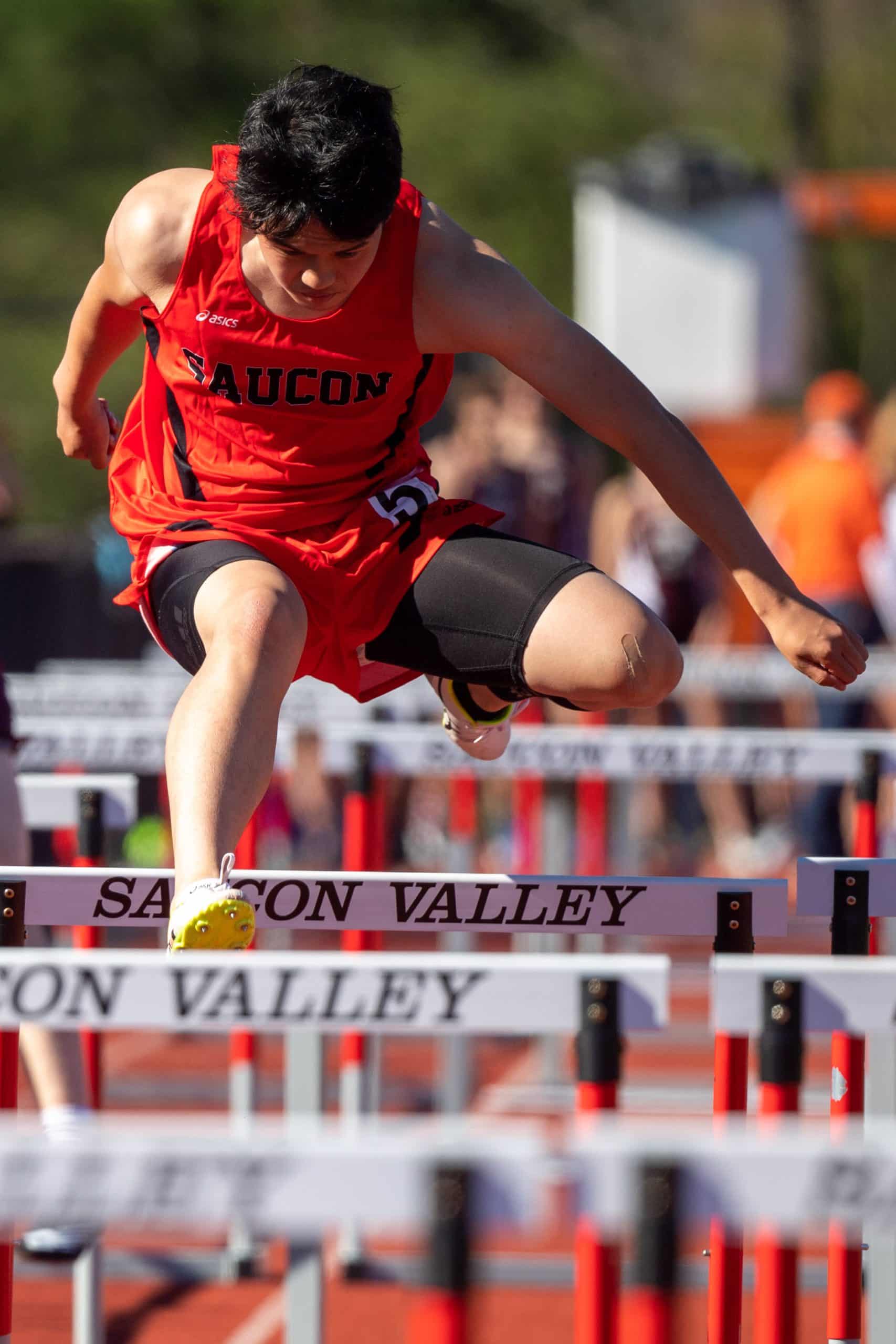 Panther junior Nicholas Brogle on his way to victory in the 110m hurdles.