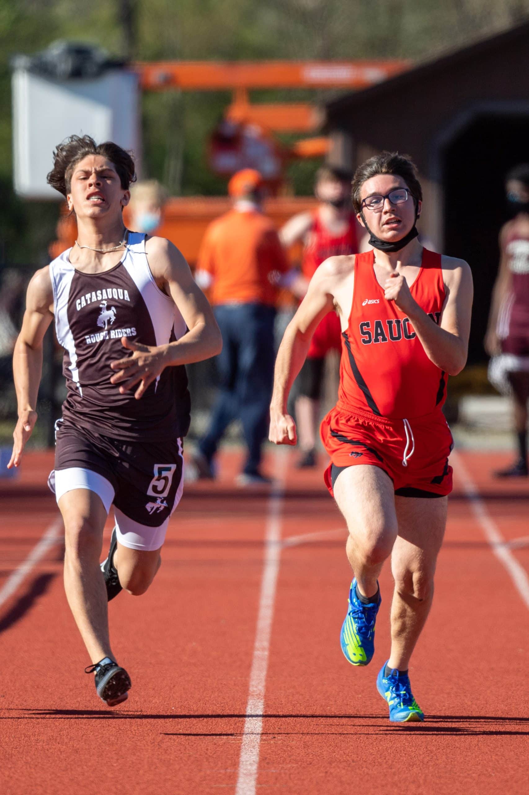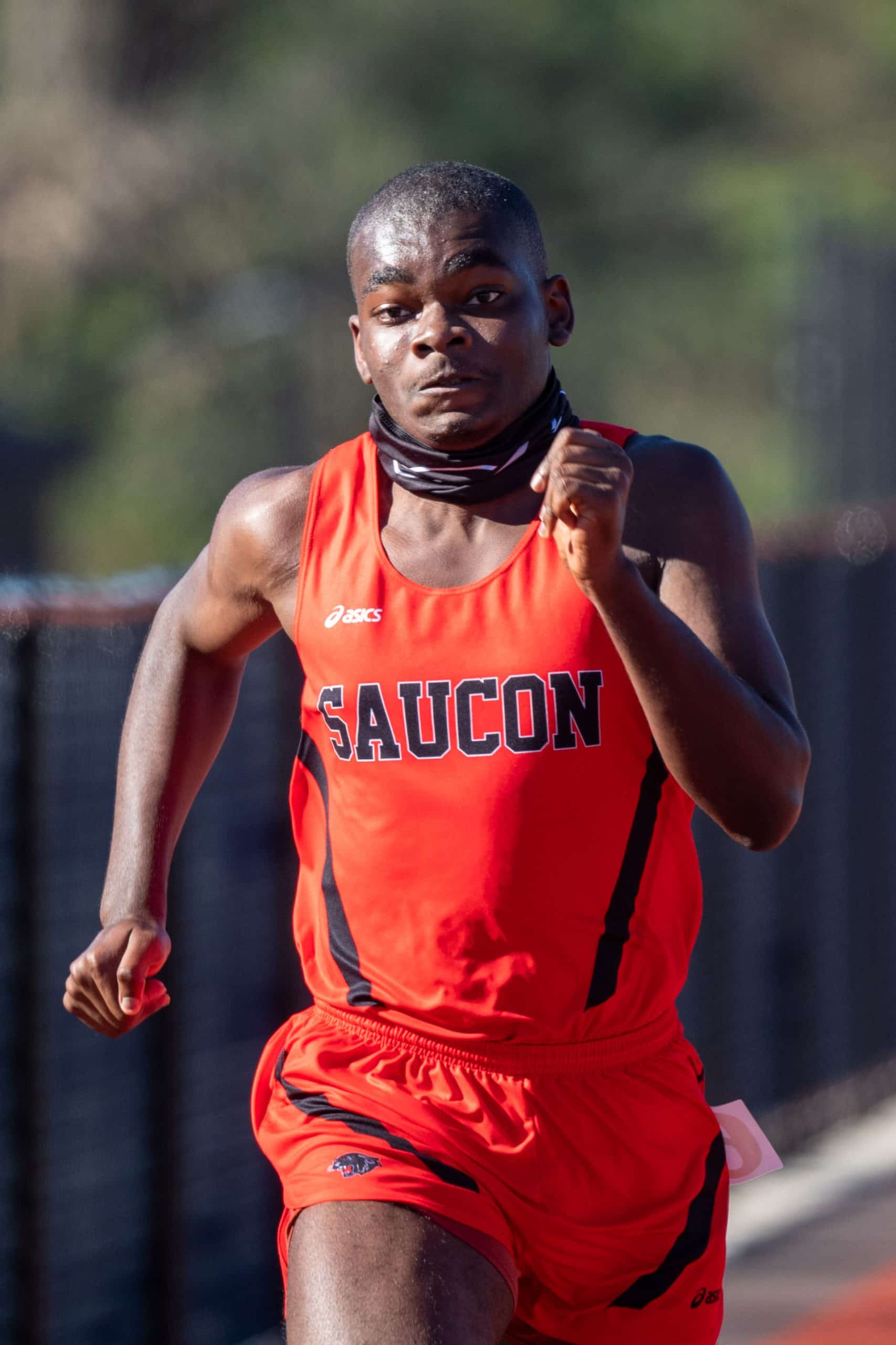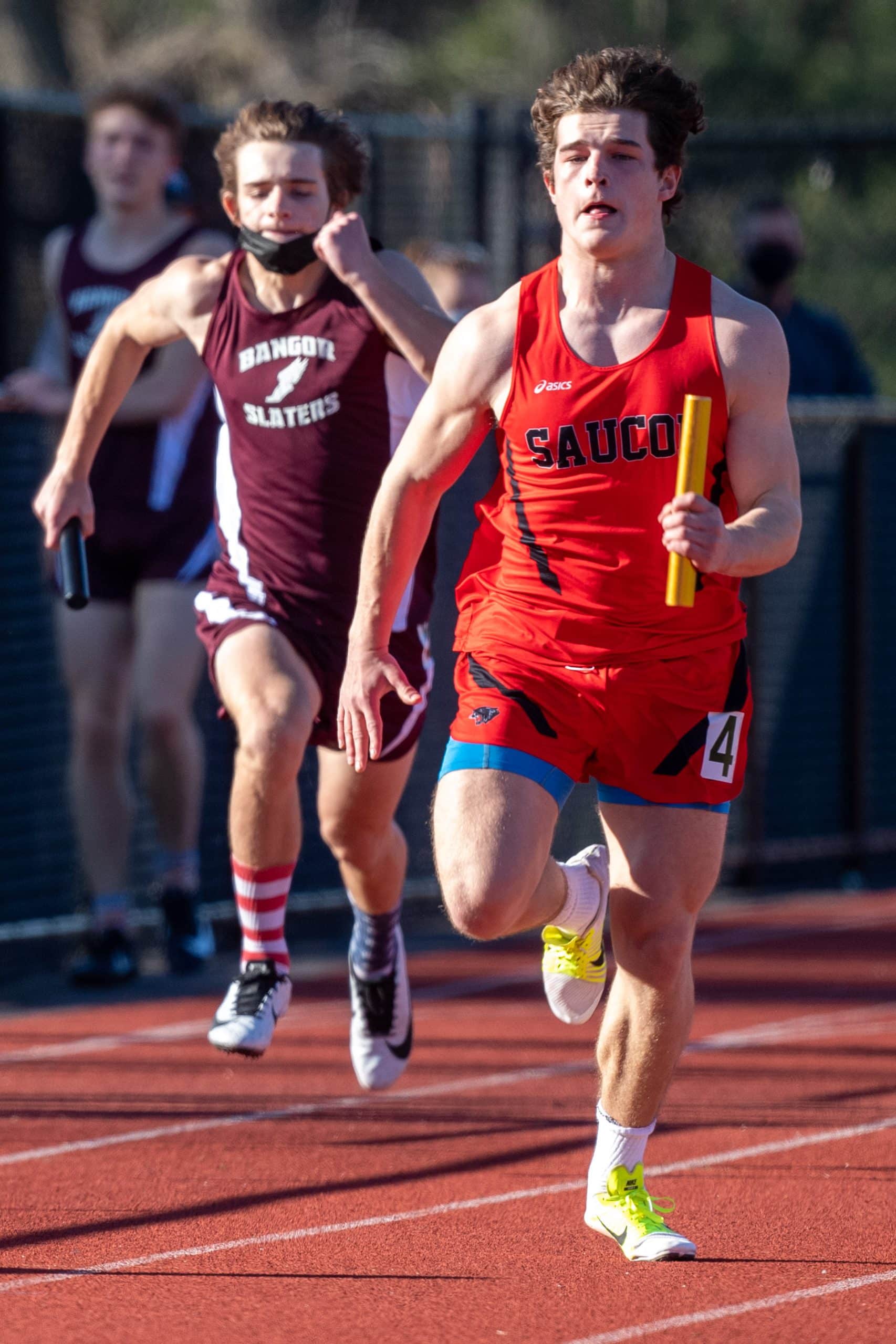 Saucon sophomore Tyler Pfizenmayer bringing home the win for the Panthers in the 4x100m relay.