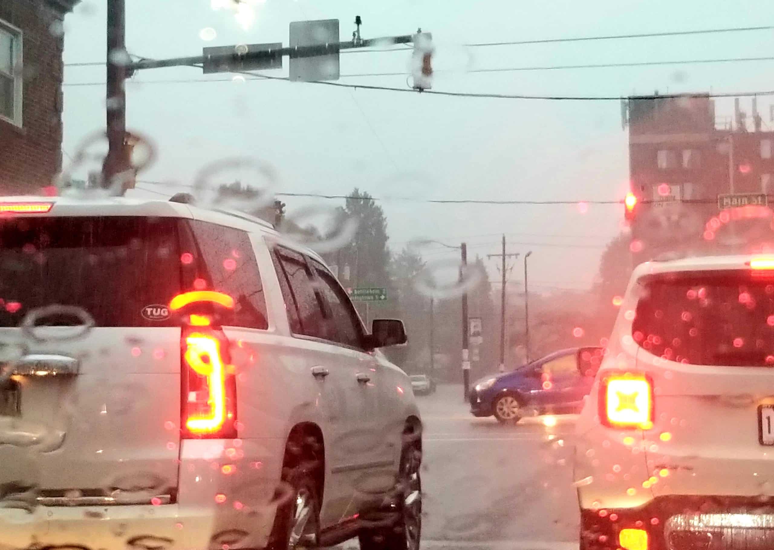 Windshield wipers were getting a workout by late Wednesday afternoon, as the evening rush hour became extremely trying for many motorists due to heavy rain. By around 5:30 p.m., stormwater runoff was also beginning to submerge roadways and sidewalks. Pictured above: Vehicles wait at the light at Water and Main streets in downtown Hellertown borough.