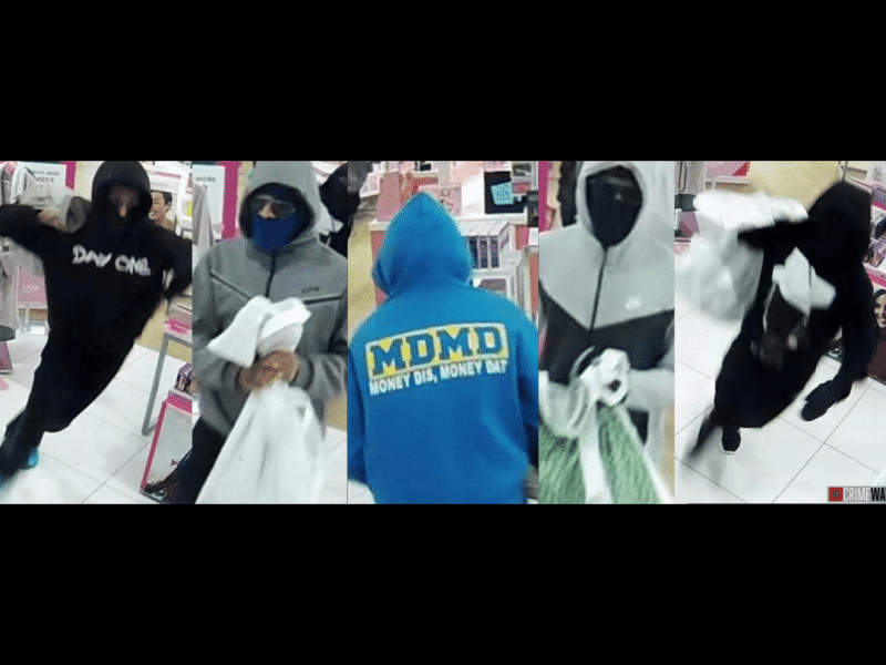 One of the men was captured on store surveillance video wearing what appeared to be a distinctive blue sweatshirt with yellow block lettering on the back that read “MDMD Money Dis, Money Dat,” while another wore a black hooded sweatshirt with the words “Day One” written across the front.
