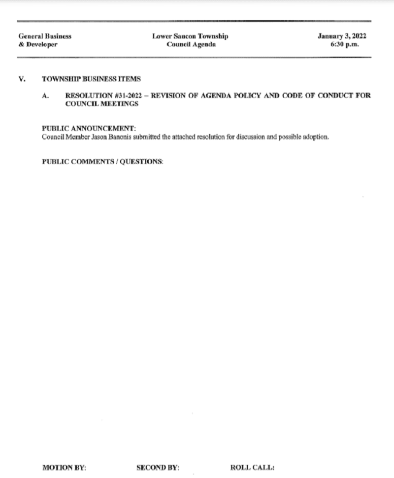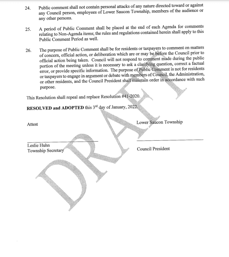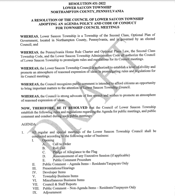 The full text of the draft resolution–which would also further codify how agendas are distributed in advance of council meetings as well as how council members may add items for discussion to meeting agendas–is below and may also be found on pp. 48-52 of the agenda for the Jan. 3 business meeting, which will begin following the reorganization meeting at 6:30 p.m. The current agenda and public comment policy may be found on pp. 53-54 of that document. Monday’s meeting–which is open to the public–will be held in Lower Saucon Town Hall, which is located at 3700 Old Philadelphia Pike, Bethlehem.