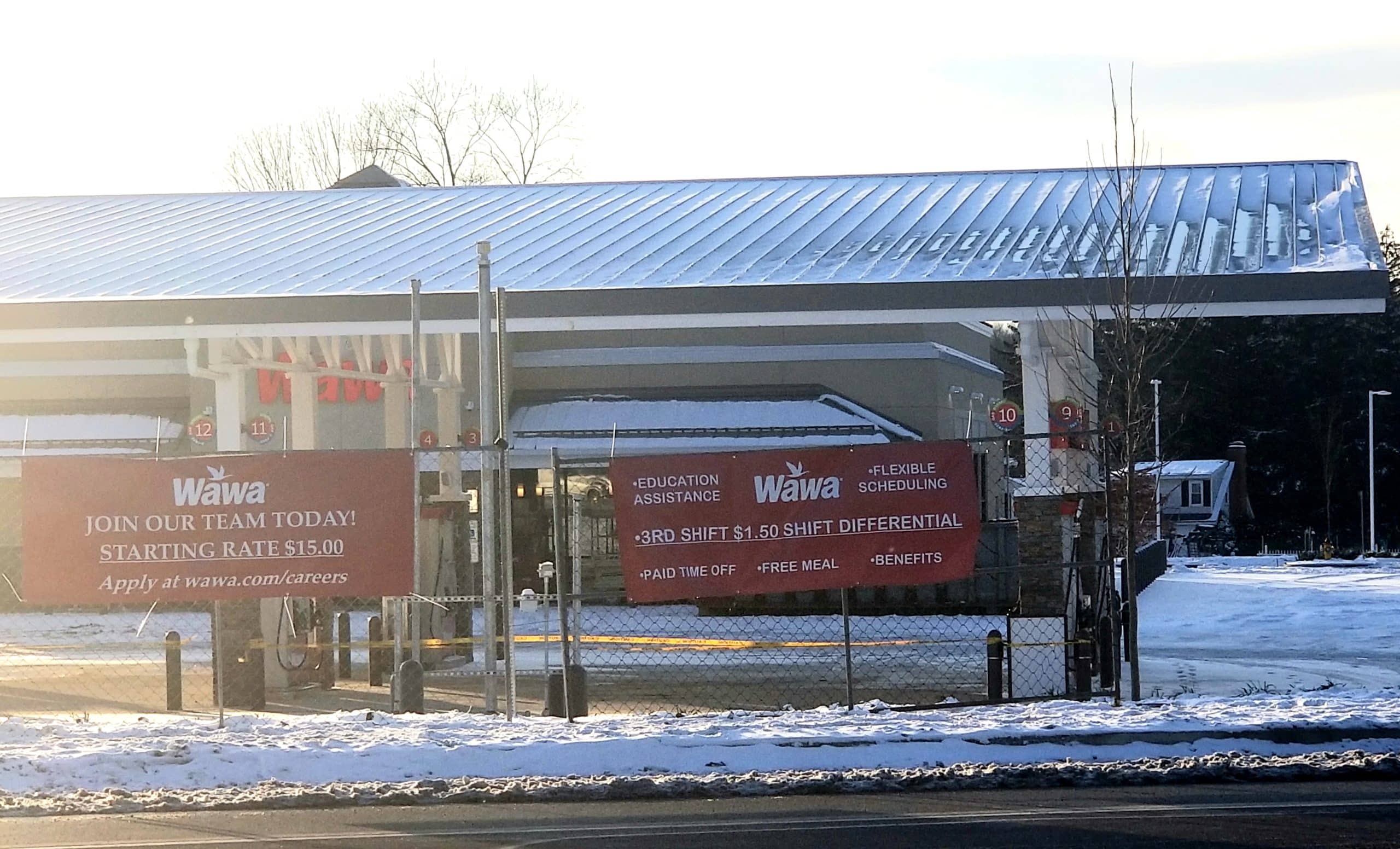 As of Friday, the company’s familiar roadside signage–which will soon display gas prices–was visible along Rt. 309 along with two banners advertising jobs with Wawa. Hung from a chainlink fence, one of the banners advertised a starting hourly rate of $15 per hour, while the other advertised a $1.50/hour 3rd shift differential, “education assistance, flexible scheduling, paid time off, free meal (and) benefits” at Wawa stores.