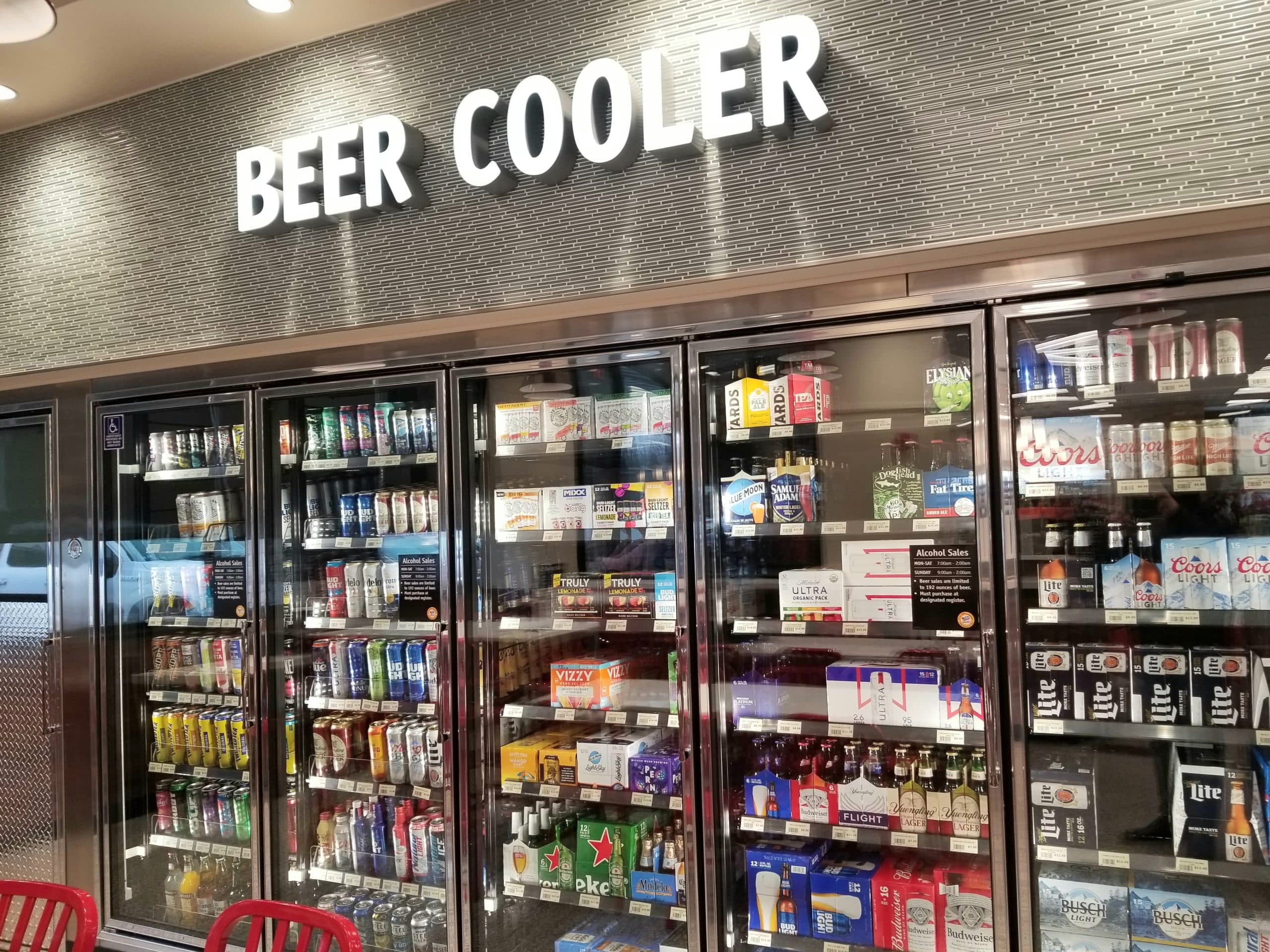 Signs advertise the hours during which beer will be sold at the Wawa.