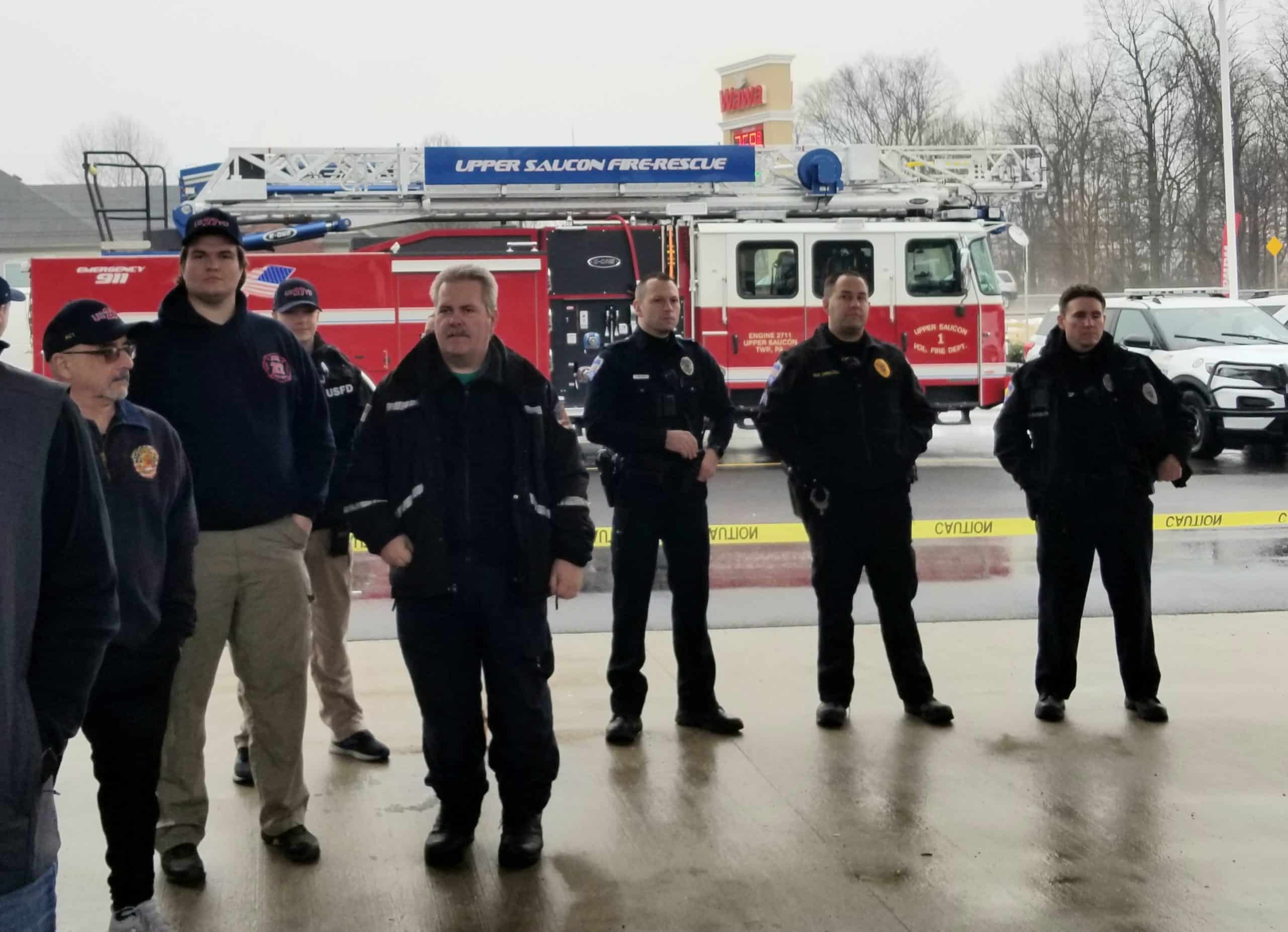 Upper Saucon Township police officers and volunteer firefighters were present for the ceremony, during which their departments each received a $1,000 donation from Wawa. The company also presented them with some of their celebrated sandwiches as part of their Hoagies for Heroes program.