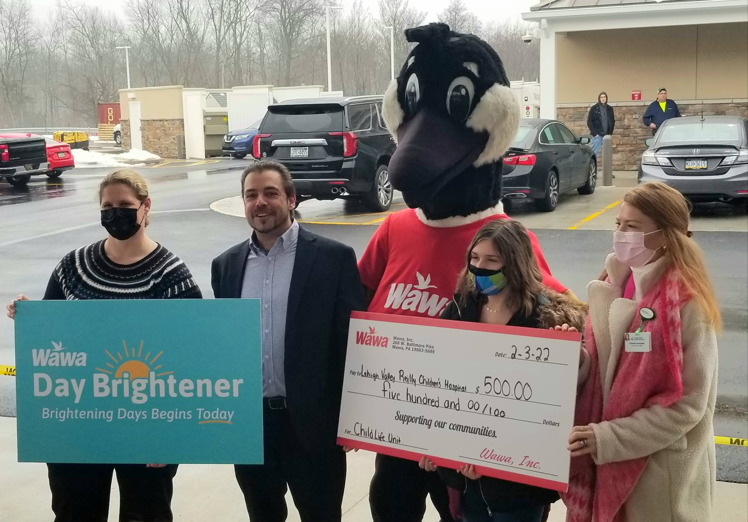 Twelve-year-old MaKenna Boss, pictured above holding a symbolic cardboard check, was honored as the Upper Saucon Township “Community Day Brightener” at the new store opening on Rt. 309 Thursday. Boss is a committed fundraiser for Lehigh Valley Health Network Reilly Children’s Hospital, and was nominated by other community members for the recognition. Thanks to her generous spirit, the hospital received a $500 donation from Wawa.