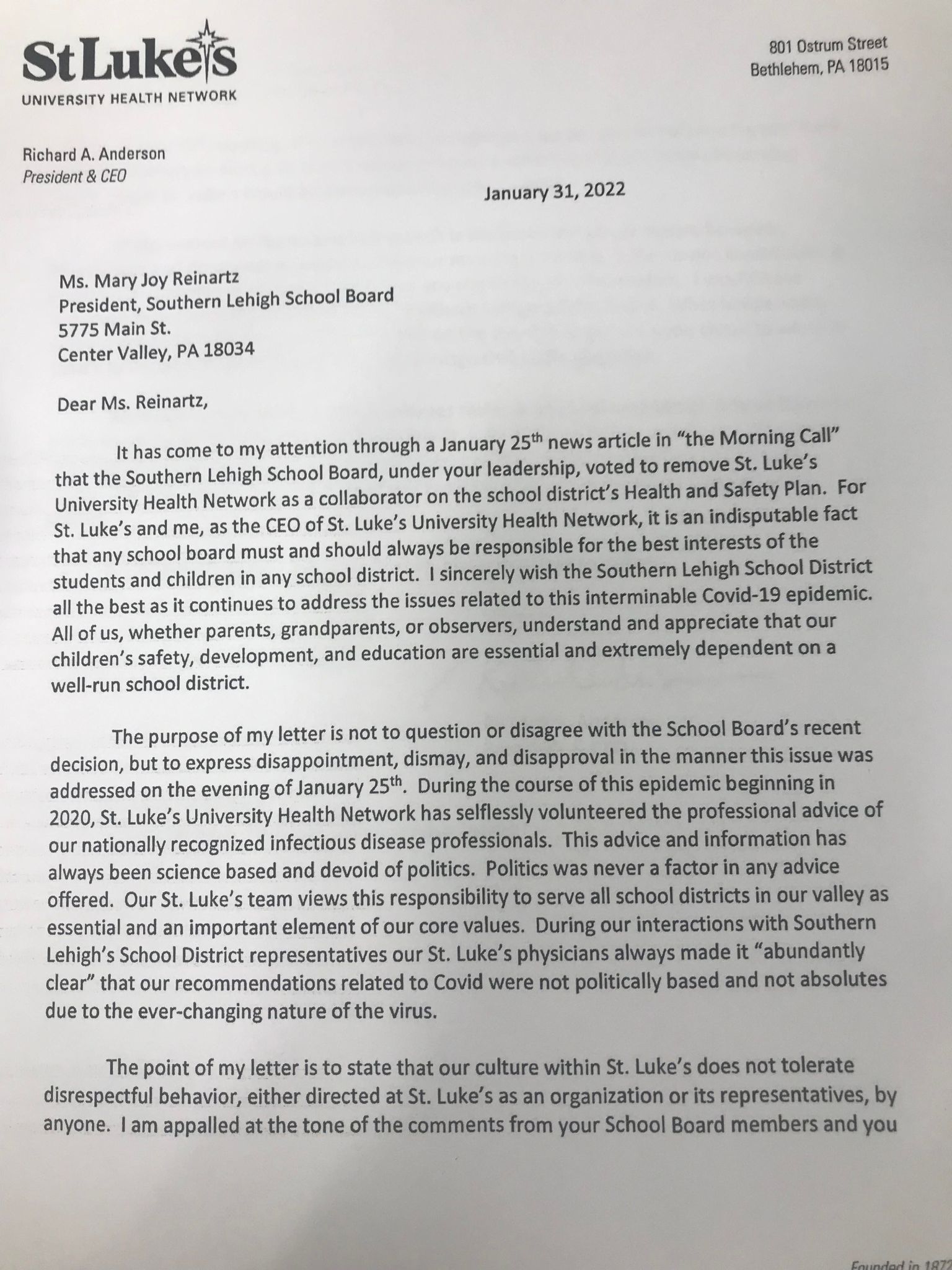 “It has come to my attention through a Jan. 25 article in ‘the Morning Call‘ that the Southern Lehigh School Board, under your leadership, voted to remove St. Luke’s University Health Network as a collaborator on the school district’s Health & Safety Plan,” Anderson wrote in the letter addressed to school board president Mary Joy Reinartz, which was also copied to district superintendent Dr. Michael Mahon.