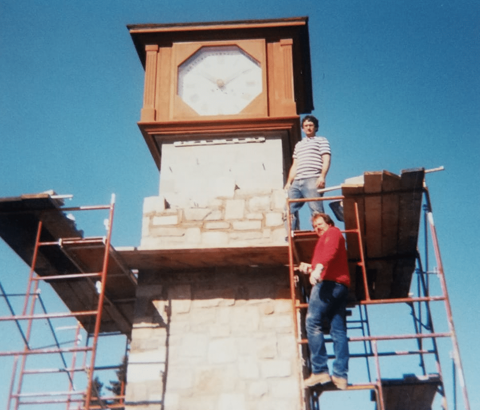 Jeff King (above) and Bill Henick (below) stand on scaffolding during the construction of the plaza clock tower in 1987. (Photo courtesy of Eric King)