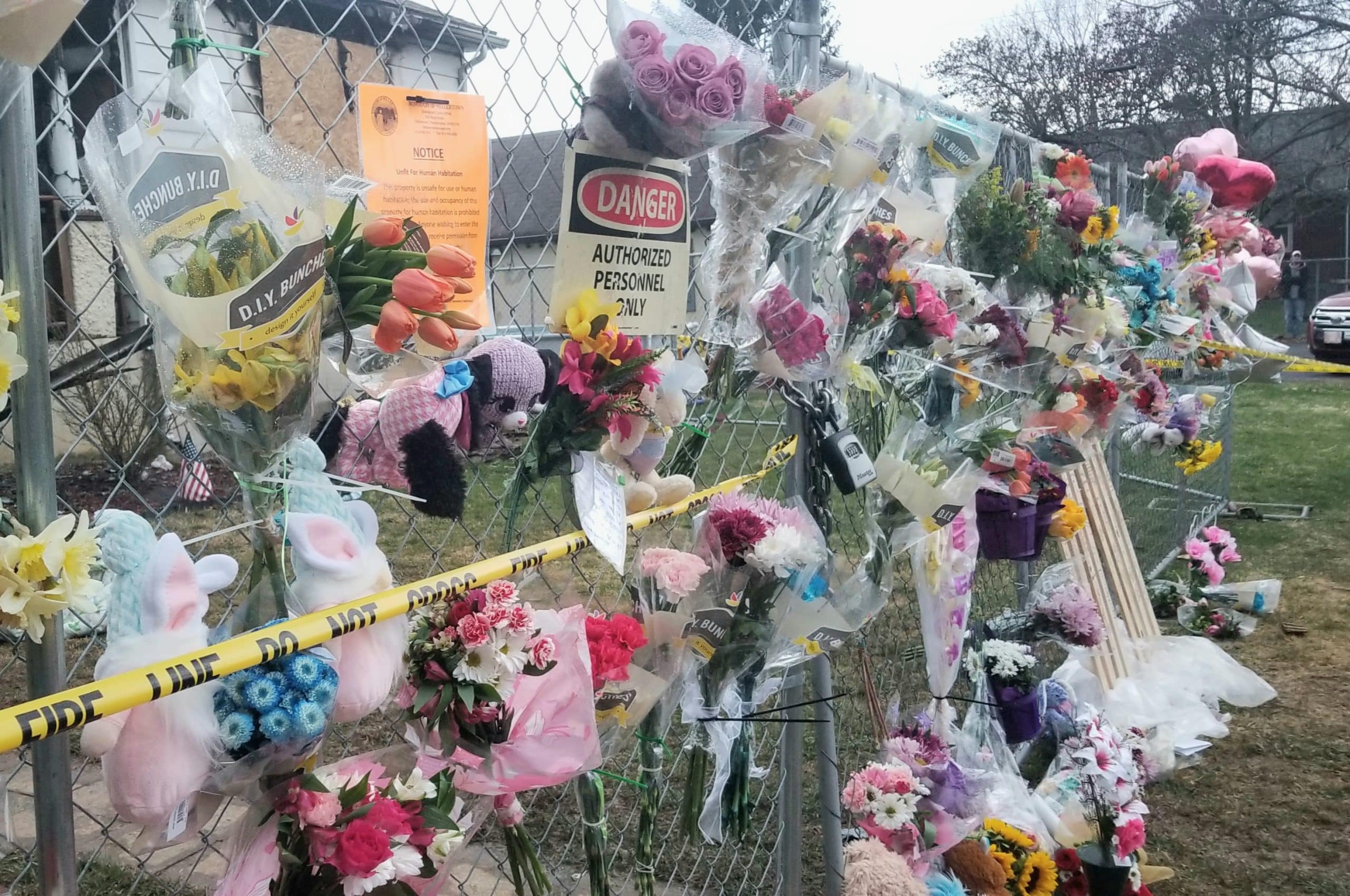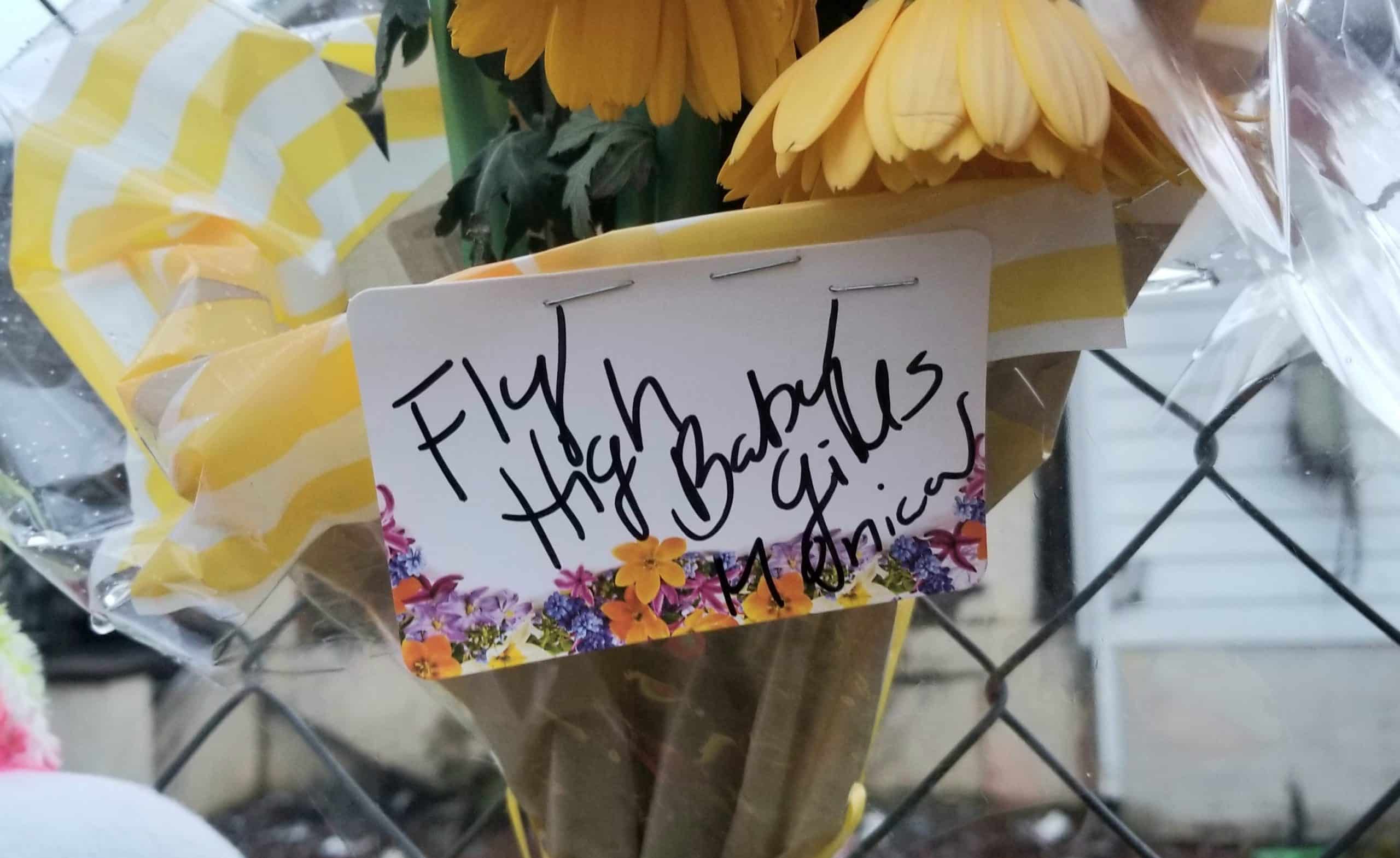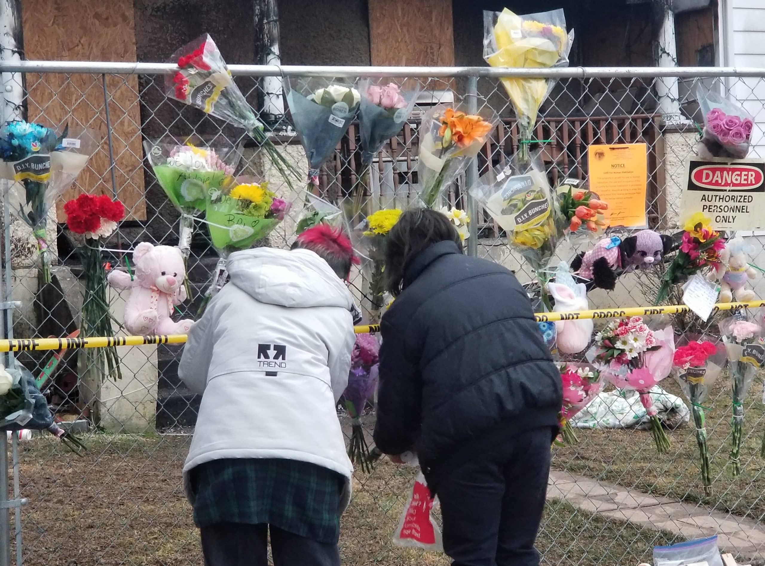 Outside the ruined home–which is now surrounded by temporary fencing–a makeshift memorial featuring flowers, messages of support, balloons and stuffed animals has been created as a place for a grief-stricken community to think about the young lives lost.