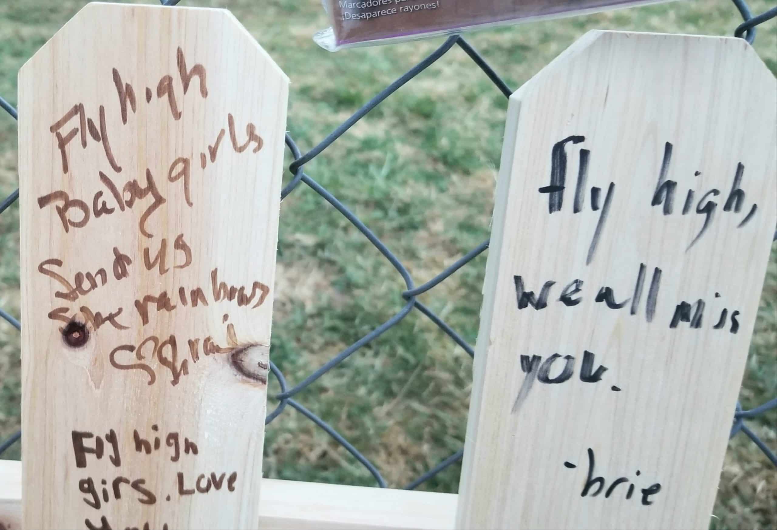 The memorial served as a backdrop for Sunday night’s vigil, which was attended by hundreds of friends, neighbors and classmates, plus others who didn’t know 15-year-old Brianna Baer and 10-year-old Abigail Kaufman but wanted to help support their family.