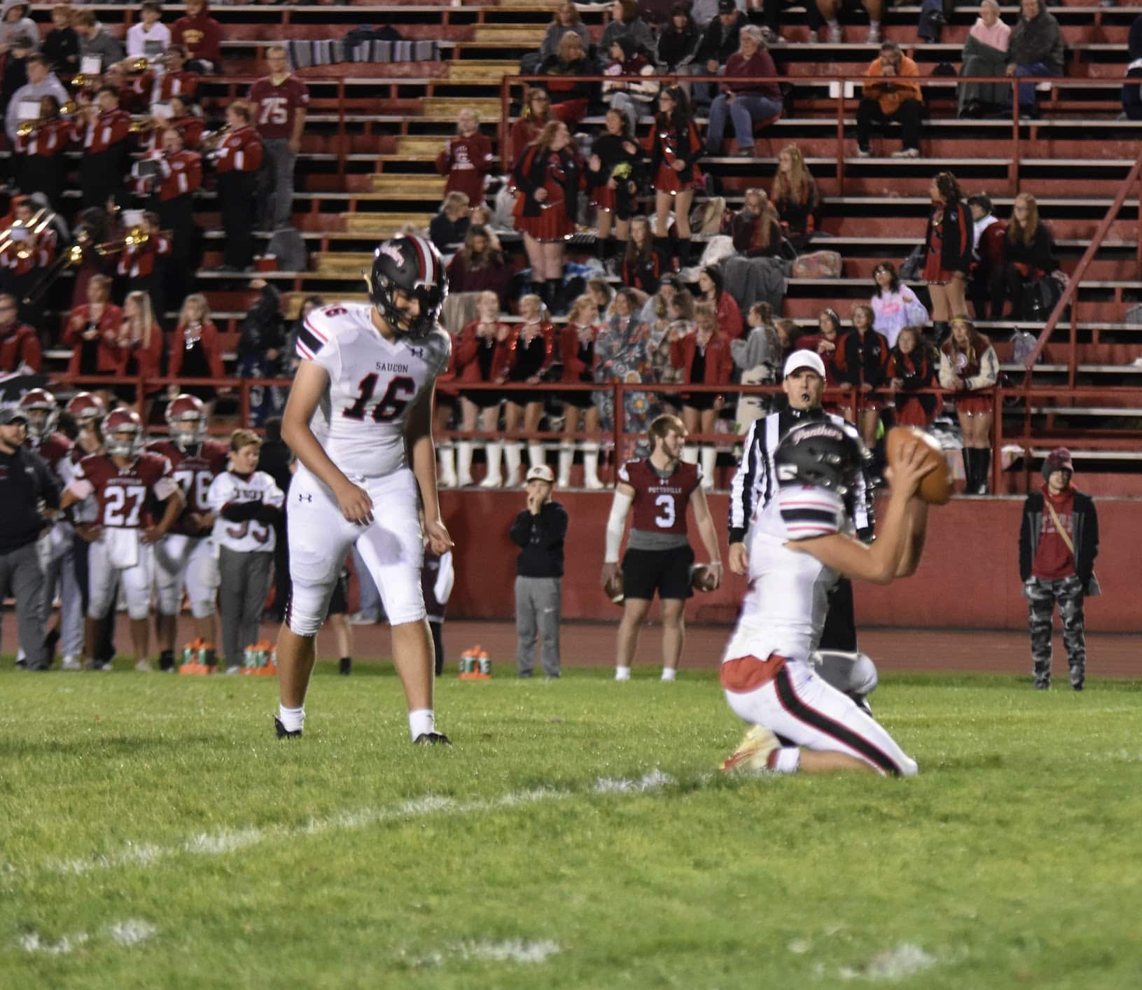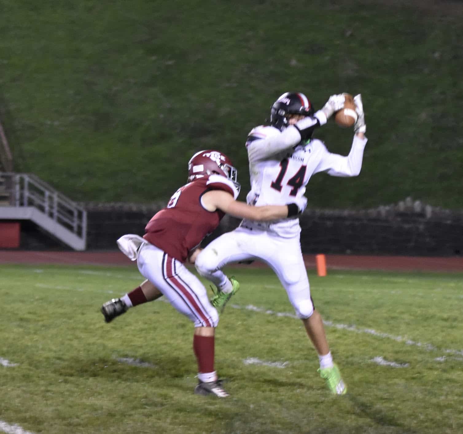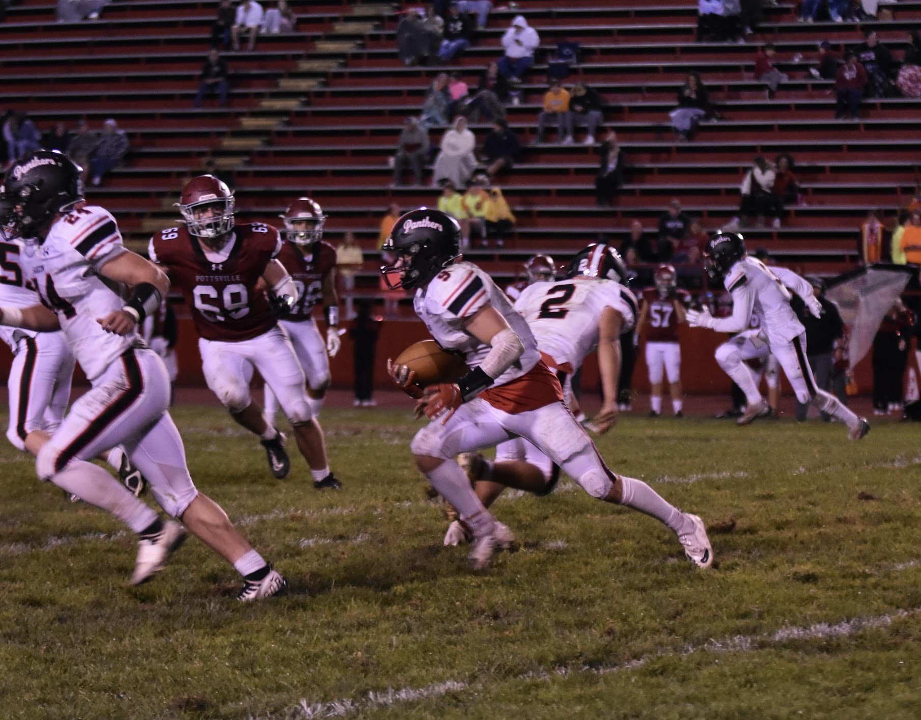Following the Crimson Tide kickoff, Saucon Valley took possession at their own 36-yardline. Riefenstahl to Robertson for 34-yards on a crossing route and Riefenstahl to Braden Weiss for 14-yards on a slant down to the Pottsville 20-yardline had the Panther faithful brimming with optimism. However, on 3rd & 10 from the 20-yardline with :40 seconds left to play, the Crimson intercepted a screen-pass intended for Ty Pfizenmayer. The Pottsville offense took the field, lined up in a “Victory” formation and took a knee to finish off the wild win. For the second week in a row, the Panthers late comeback bid came up short. Pottsville held on the defeat Saucon Valley 19-14.