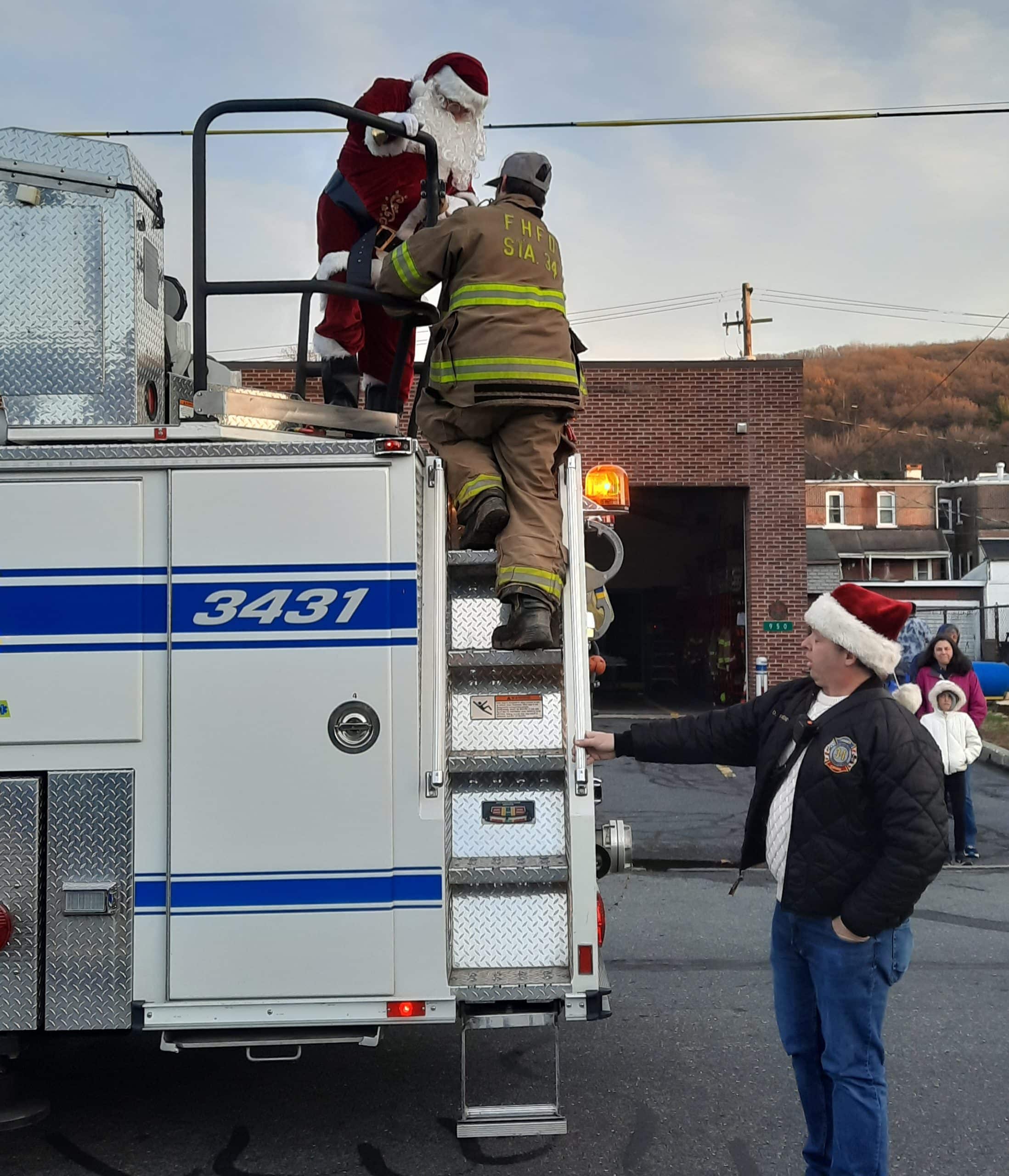 Then, as a caravan of borough emergency vehicles approached the area of the fire station–adjacent to where the tree stands–the crowd’s excitement noticeably increased, as Santa Claus waved to them from atop a large Fountain Hill Fire Department ladder truck.