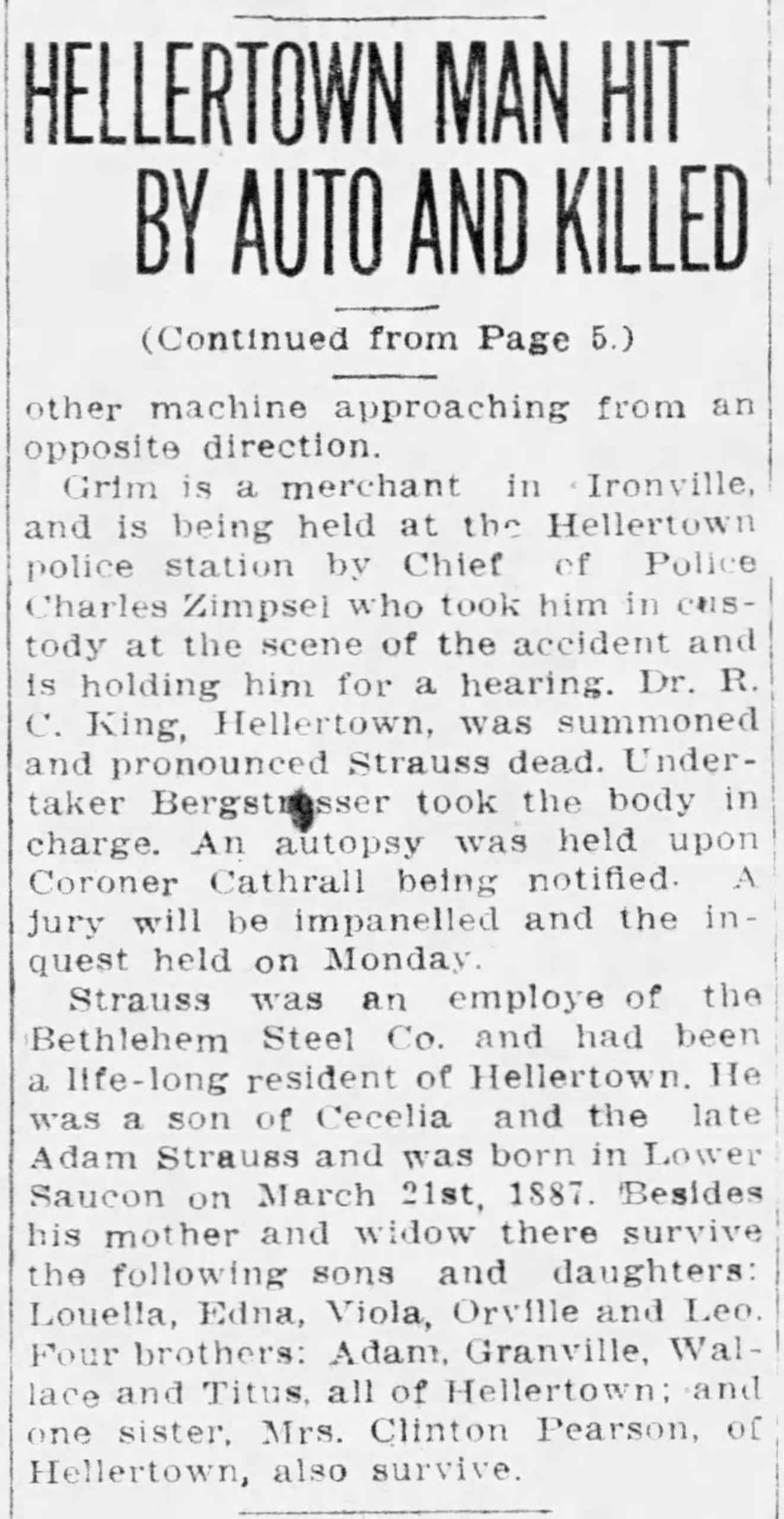 Grim was an Ironville merchant, according to the story, and he was taken into custody at the accident scene by Hellertown Police Chief Charles Zimpfer, pending a court hearing.