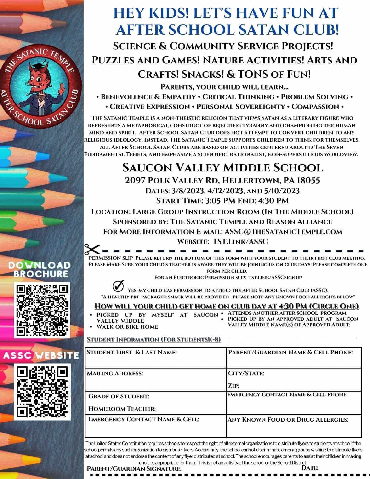 Pictured below, the flyer that was circulated to families of Saucon Valley students on Monday. (Credit: The Satanic Temple/After School Satan Club)
