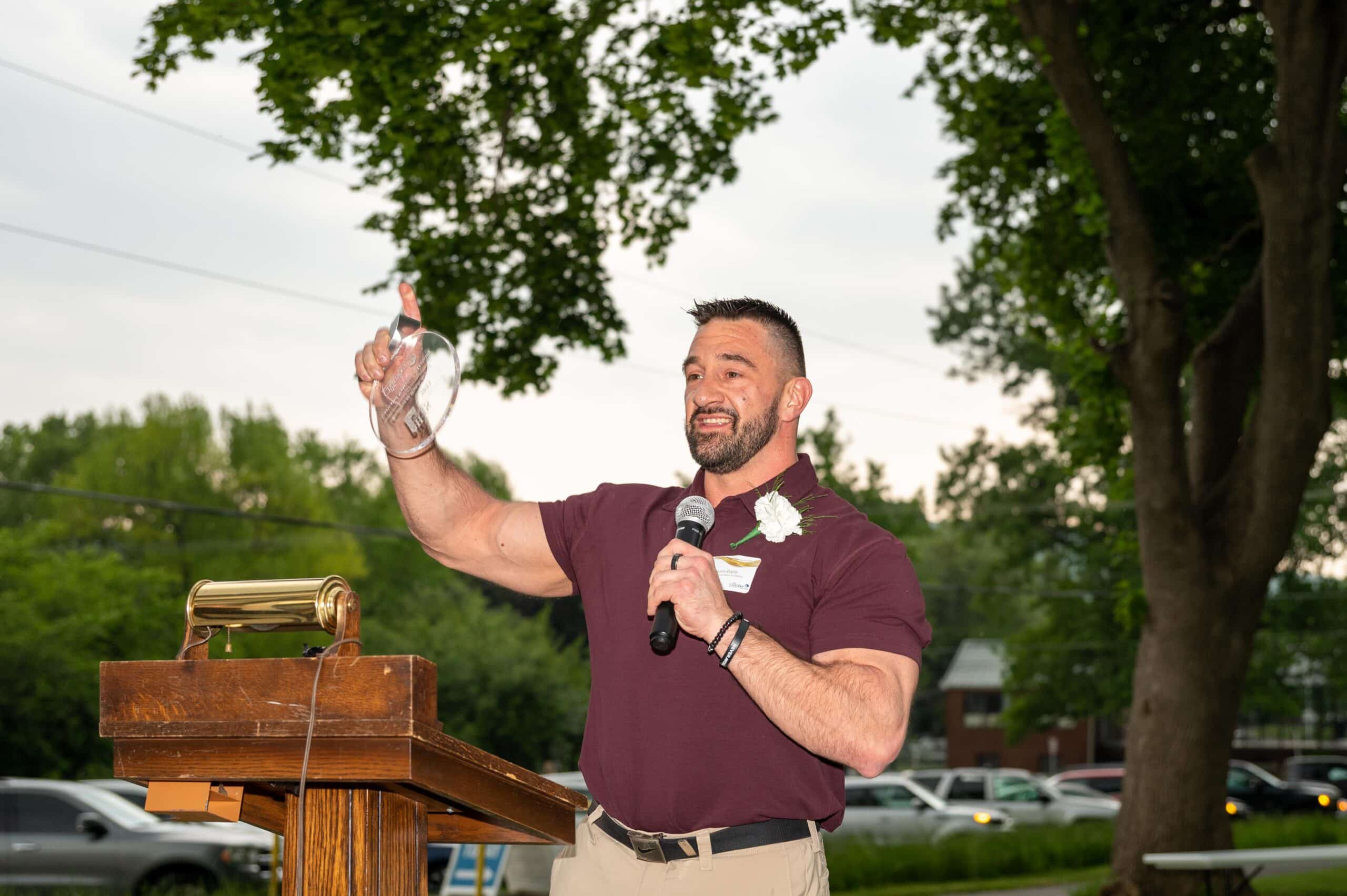 Saucon Valley Farmers Market board member Josh Popichak speaks after he and fellow board members Paul Farruggia and Maria Schaller accepted the Hellertown-Lower Saucon Chamber’s 2023 Champion Non-Profit Award at Wednesday’s Honors & Hors D’oeuvres event in Dimmick Park. Popichak said he views their role as caretakers of the market, which has grown significantly since its first season in 2006, when it was held in a bank parking lot on Main Street. He encouraged attendees to visit and support the weekly market, where nearly 40 vendors sell locally-grown produce, meat, cheese, eggs, baked goods, health and beauty products, soap and more.
