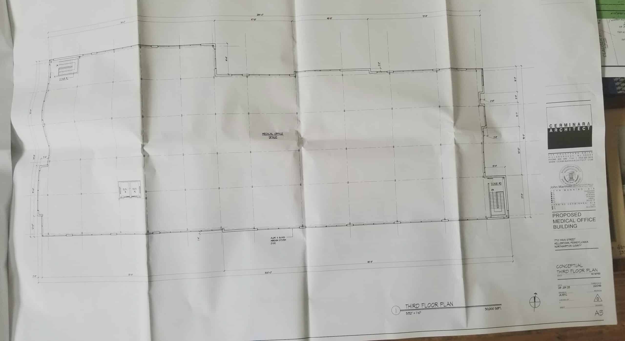 The plans show a three-story, 90,000 square foot building with a hospital facility located on the first floor, and medical office space on the second and third floors.