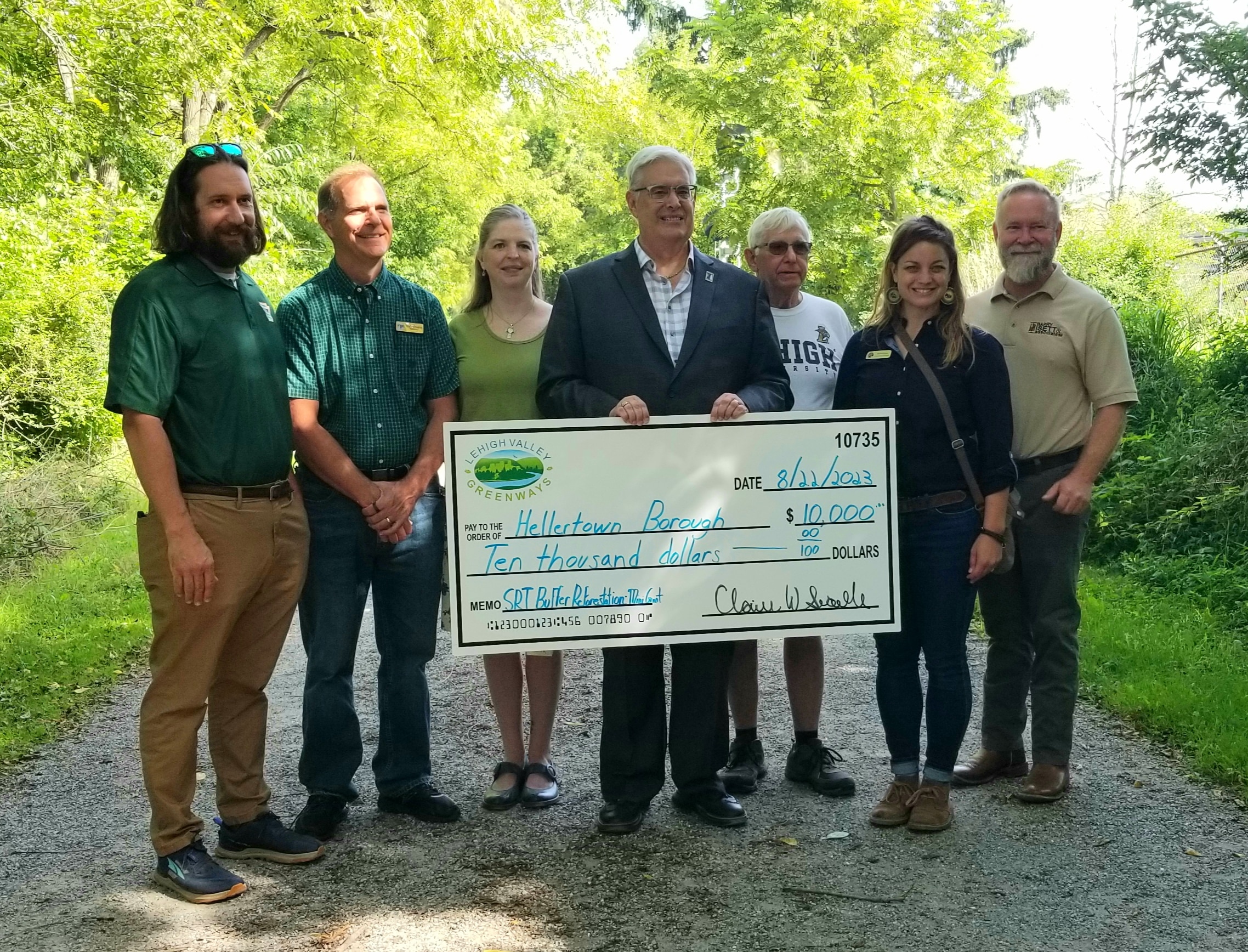 Borough officials including borough manager Cathy Hartranft, mayor David Heintzelman and council members Liz Thompson, Earl Hill and Andrew Hughes joined with representatives from Lehigh Valley Greenways and the Pennsylvania Department of Conservation and Natural Resources (DCNR) to celebrate the upcoming tree plantings with a formal check presentation Tuesday.