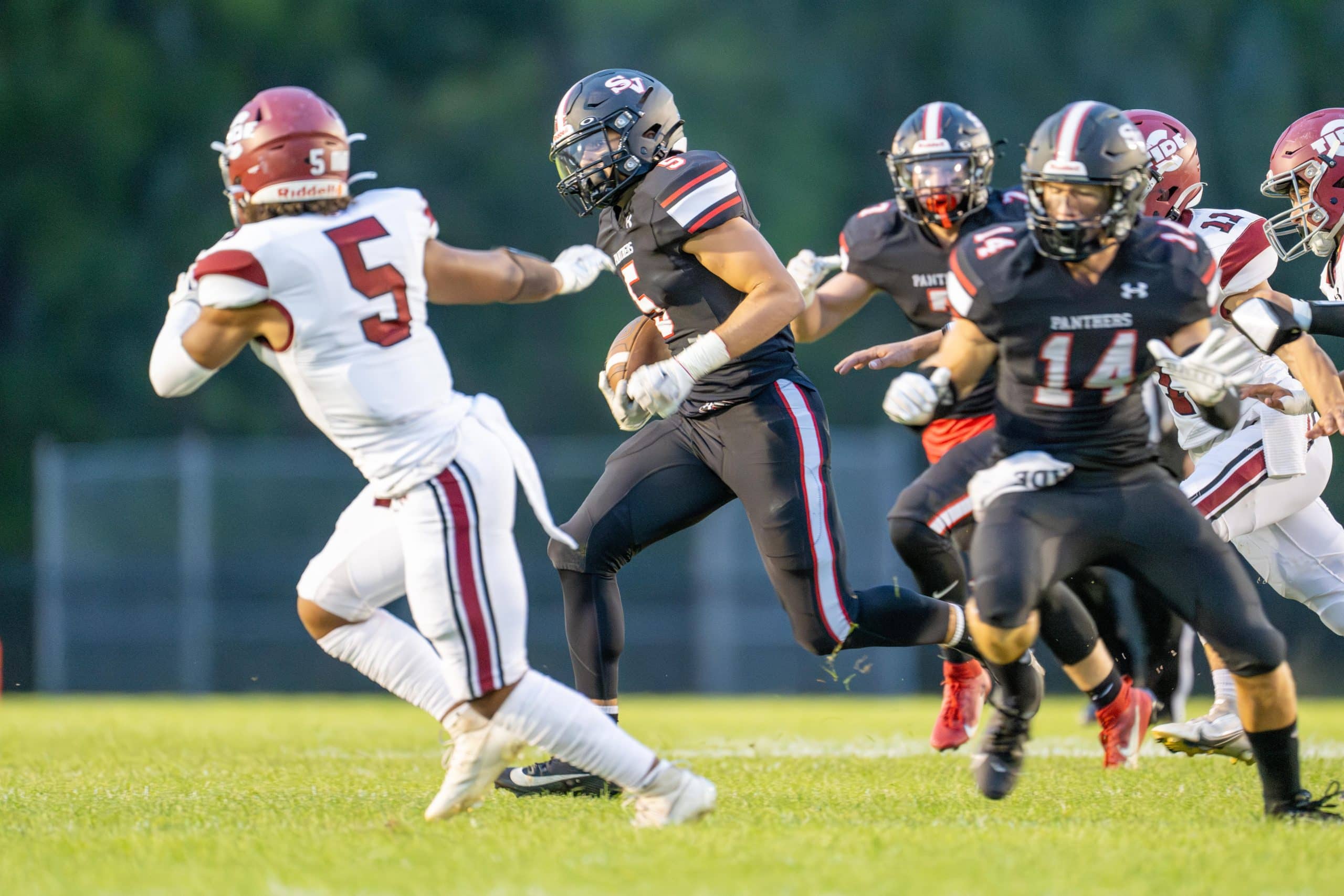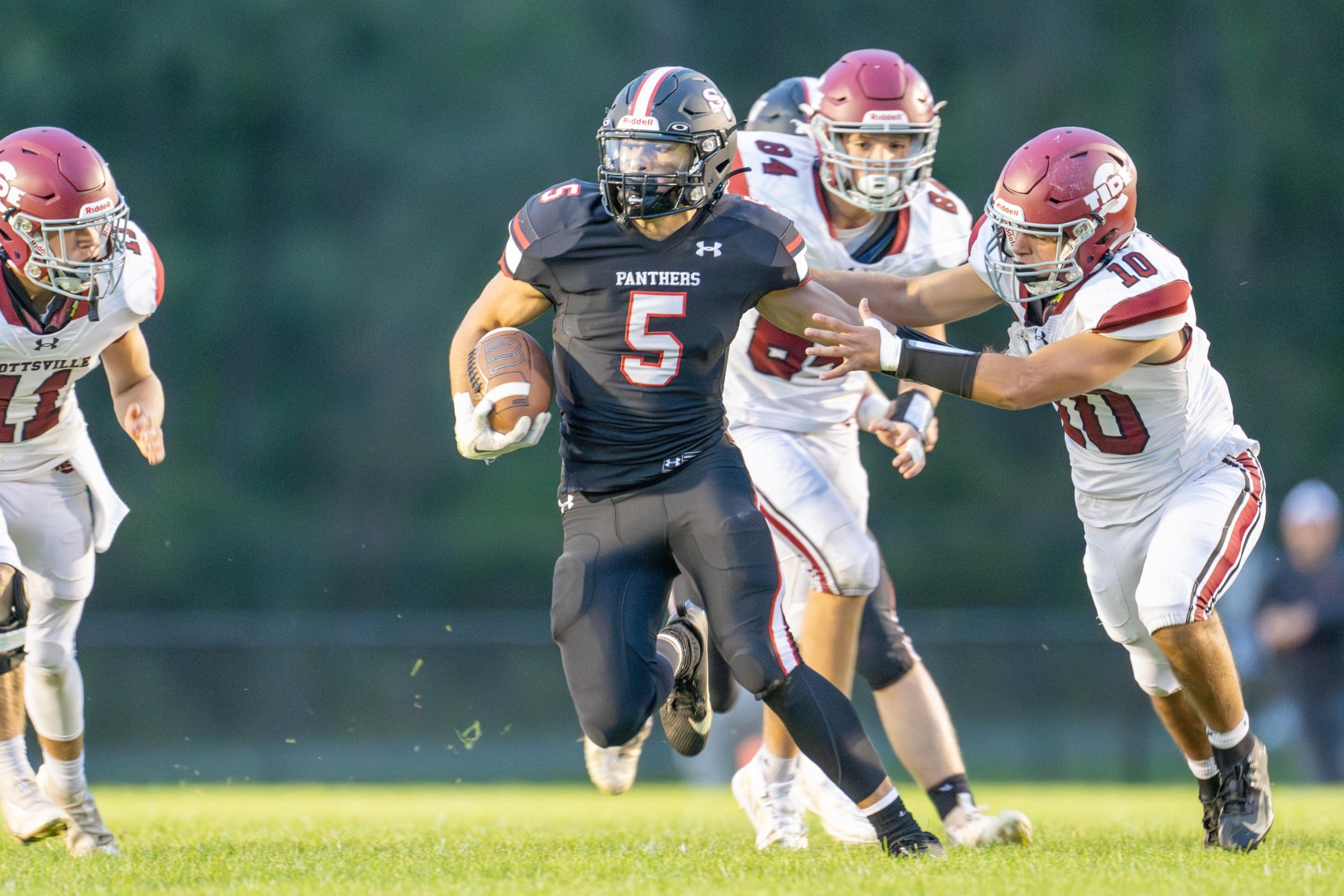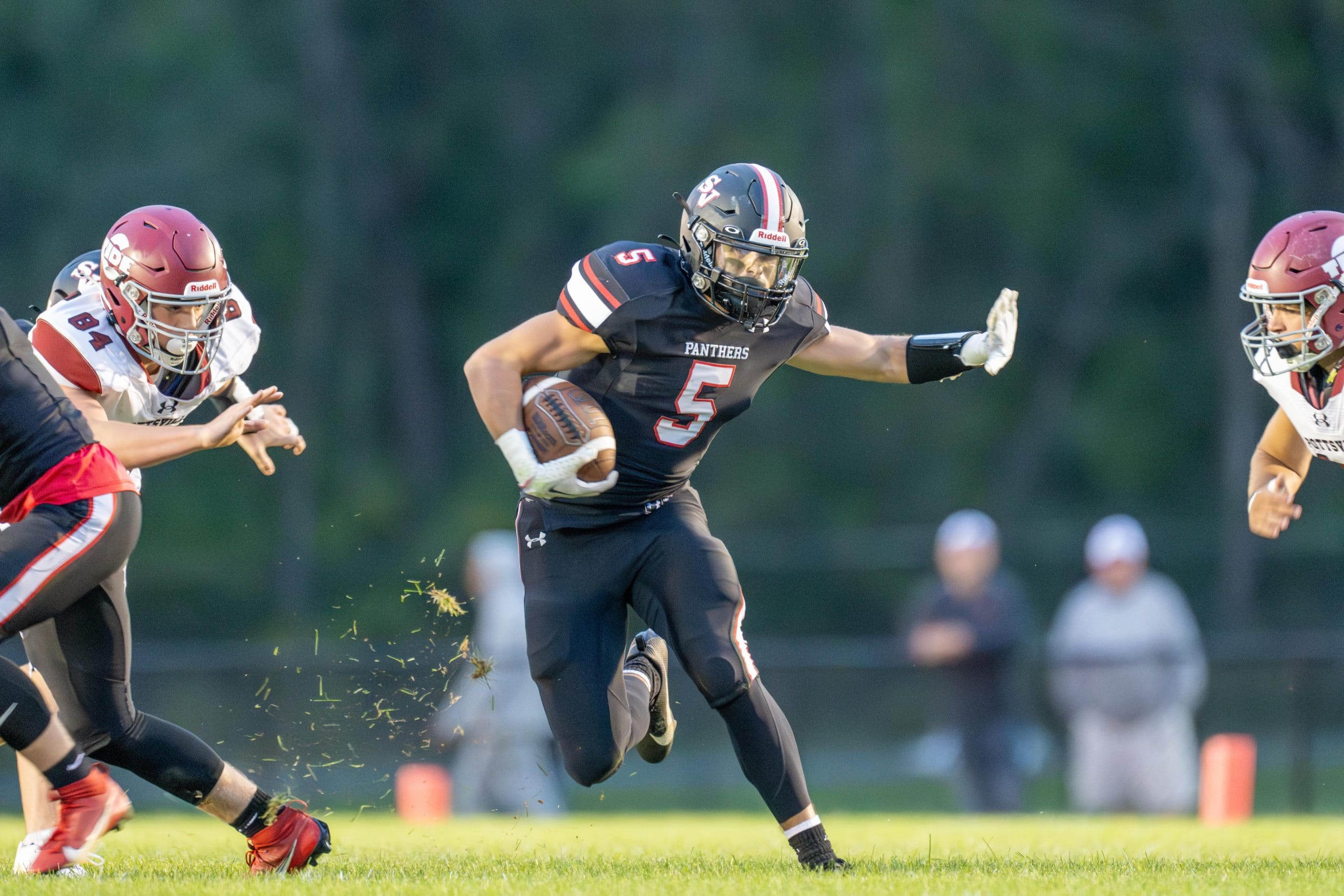 Senior Constantine Donahue moves the ball down field for the Panthers in their Sept. 22 game against Pottsville. The Panthers beat the Crimson Tide 21-9 and next face the Northwestern Lehigh Tigers this Friday at 7 p.m. (Credit: Chris Christian)
