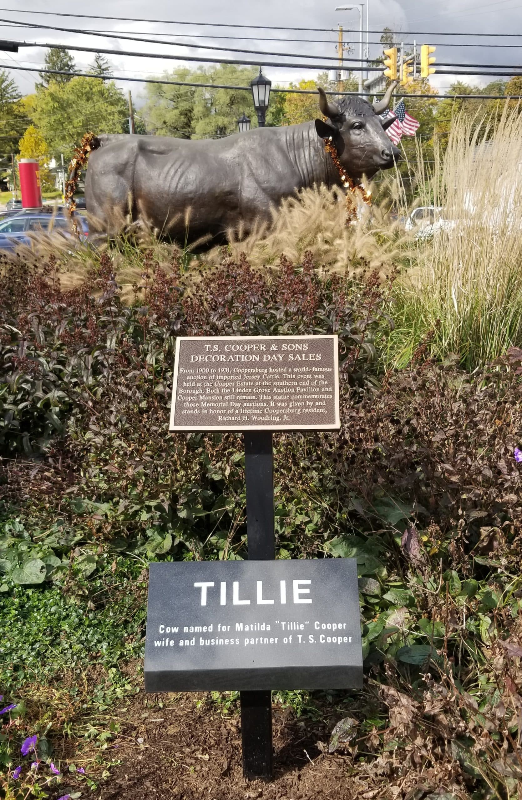 A plaque unveiled in front of Tillie explains that she is named in honor of Matilda “Tillie” Cooper (1854-1918), the wife and business partner of Tilghman Schantz “T.S.” Cooper (1848-1928), whose Decoration Day Jersey cattle sales made Coopersburg world famous in the early 1900s.
