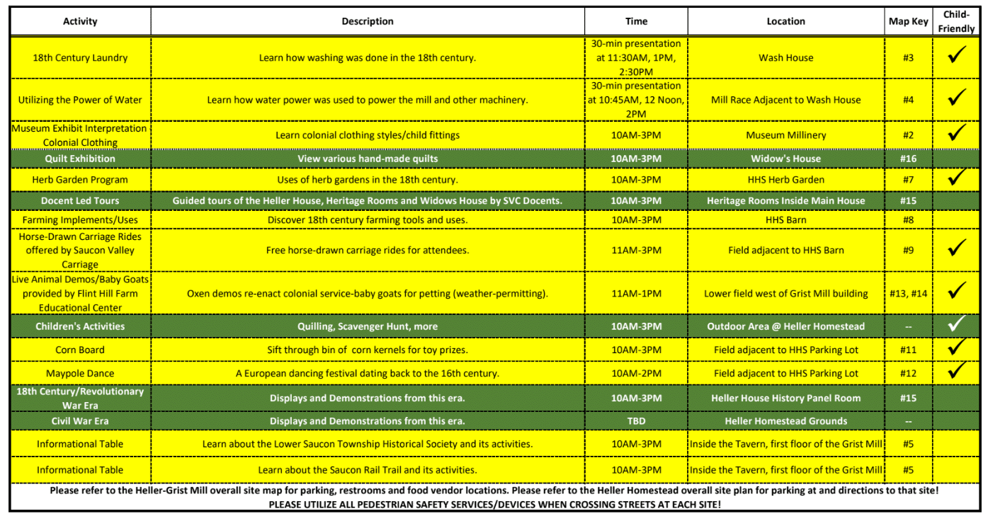 Attendees should note that the Lutz-Franklin Schoolhouse, which is maintained by the Lower Saucon Township Historical Society, will not be open for Heritage Day. Instead, LSTHS volunteers will be set up at the Heller-Wagner Grist Mill with educational activities and old-fashioned games for children, including a Maypole.